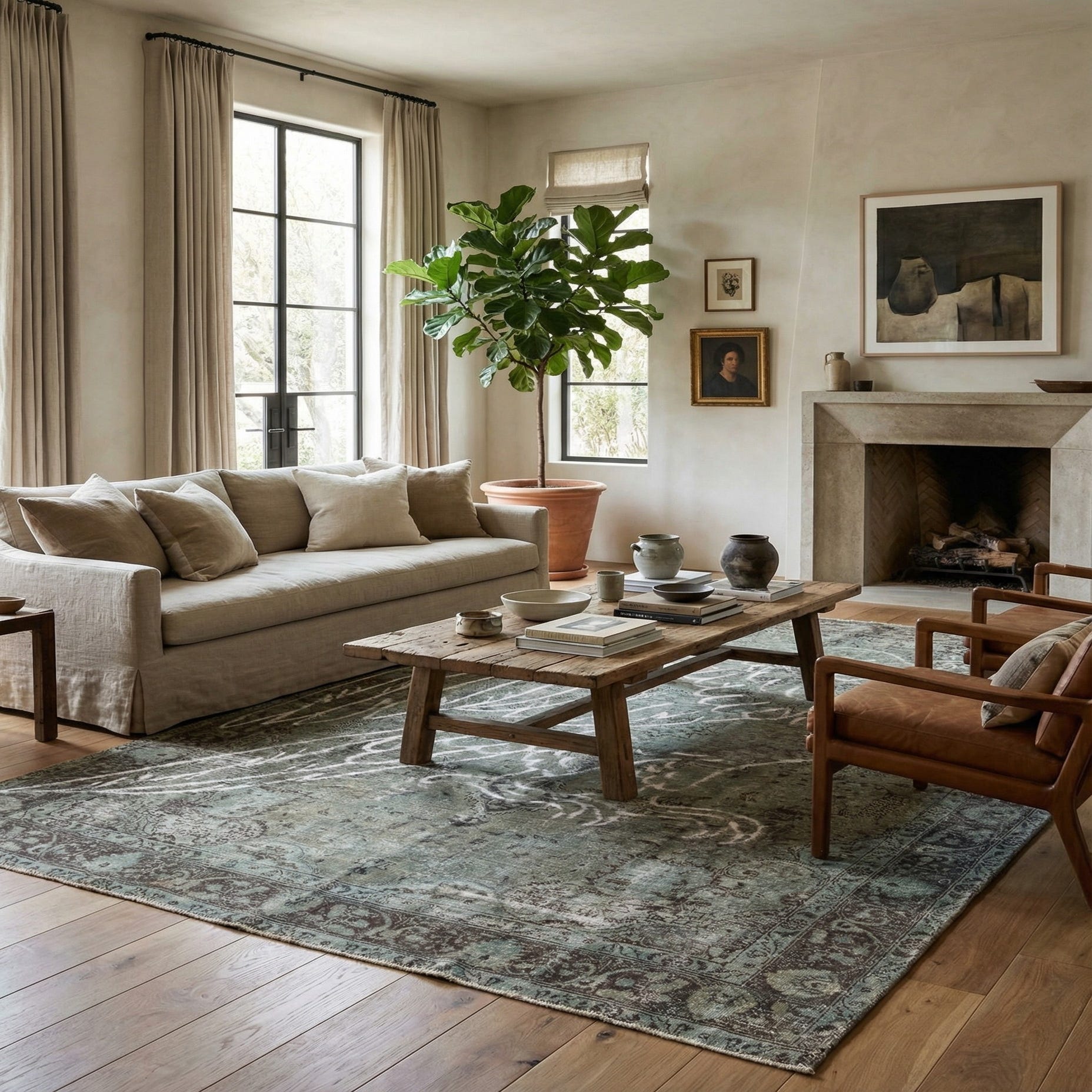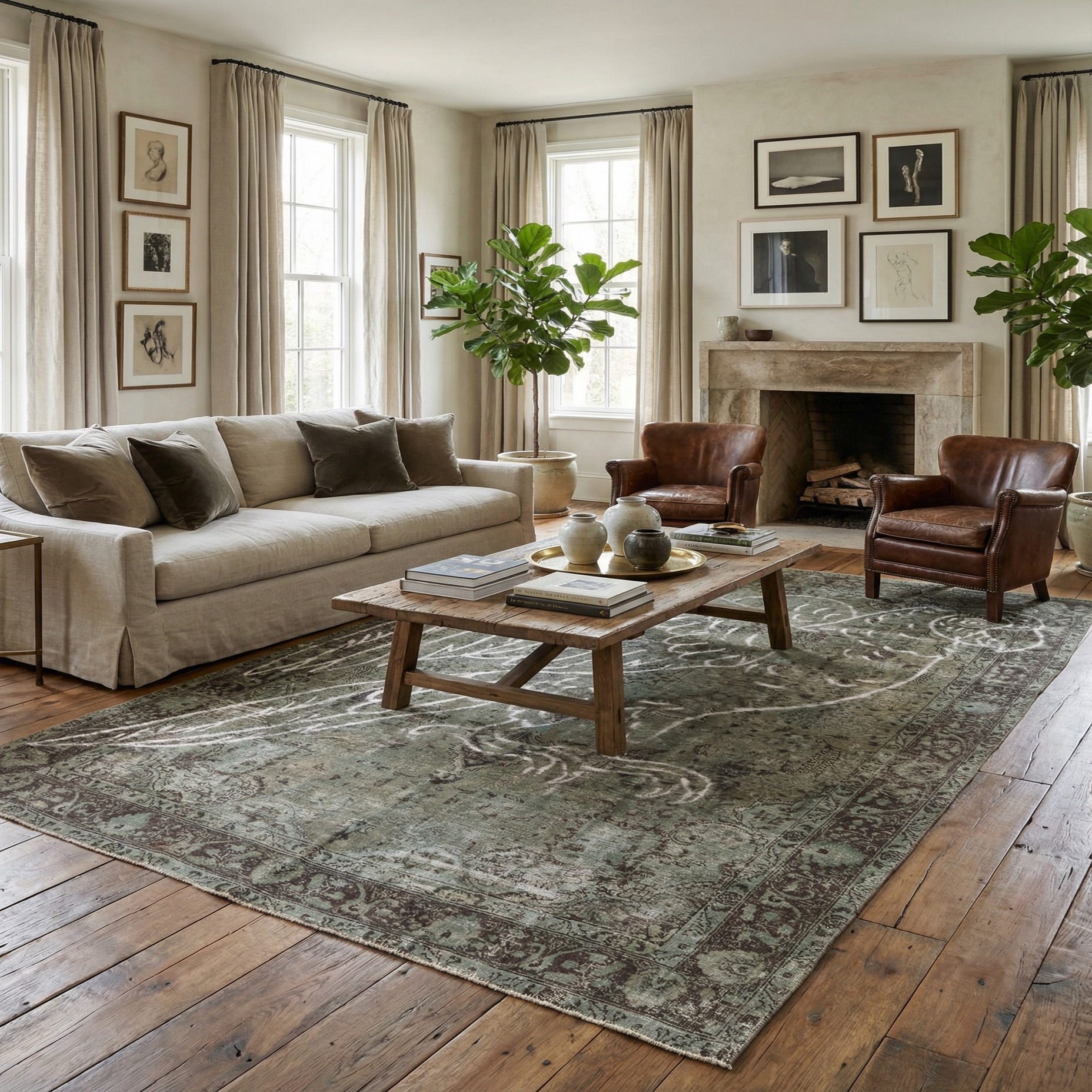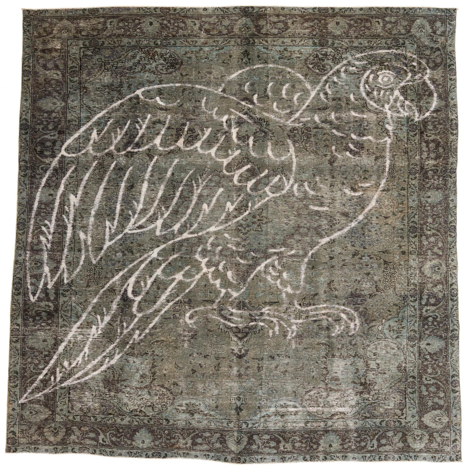 An 8x11 rectangular green wool rug with a distressed vintage Persian pattern and a large white parrot outline.