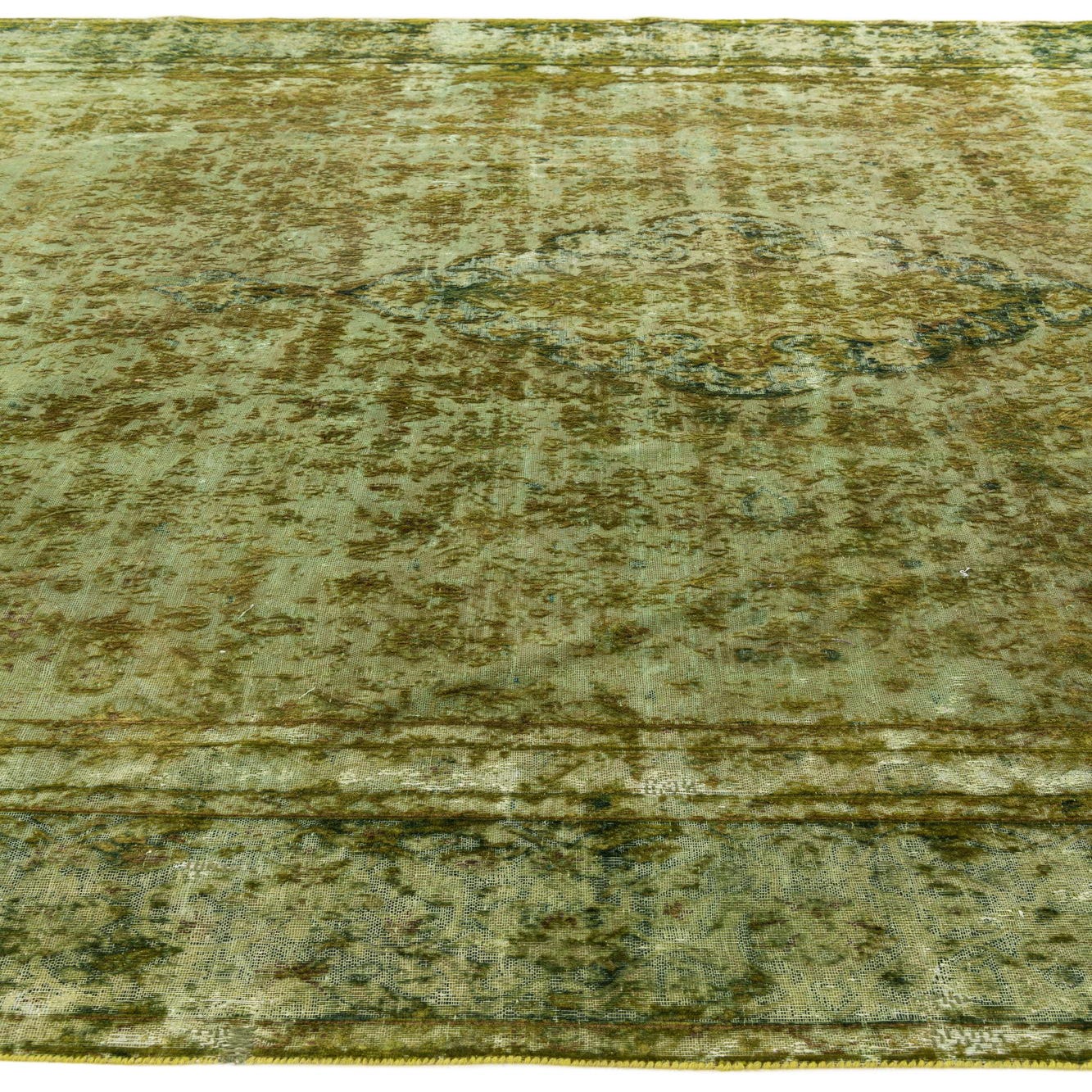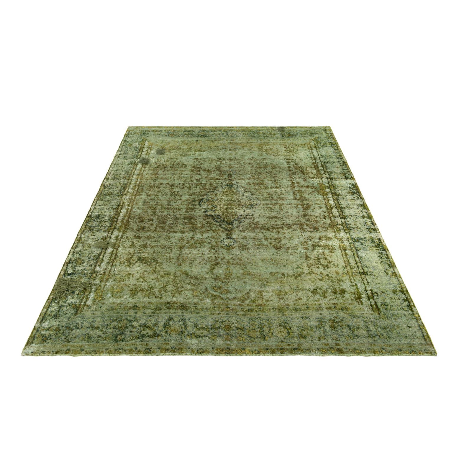 A 9x12 rectangular Ultra Vintage wool rug in varying shades of green with a faded Persian medallion pattern.