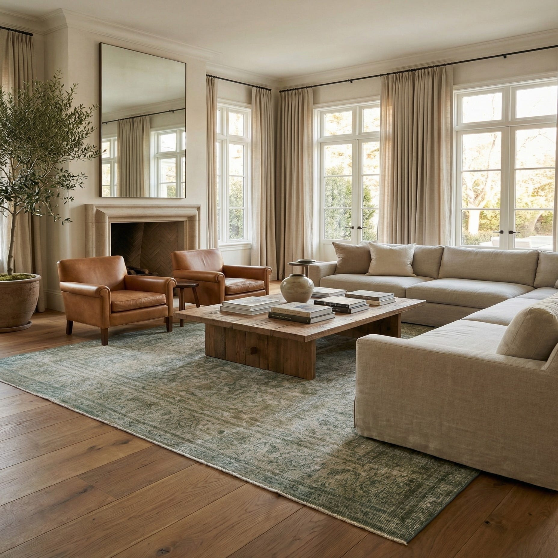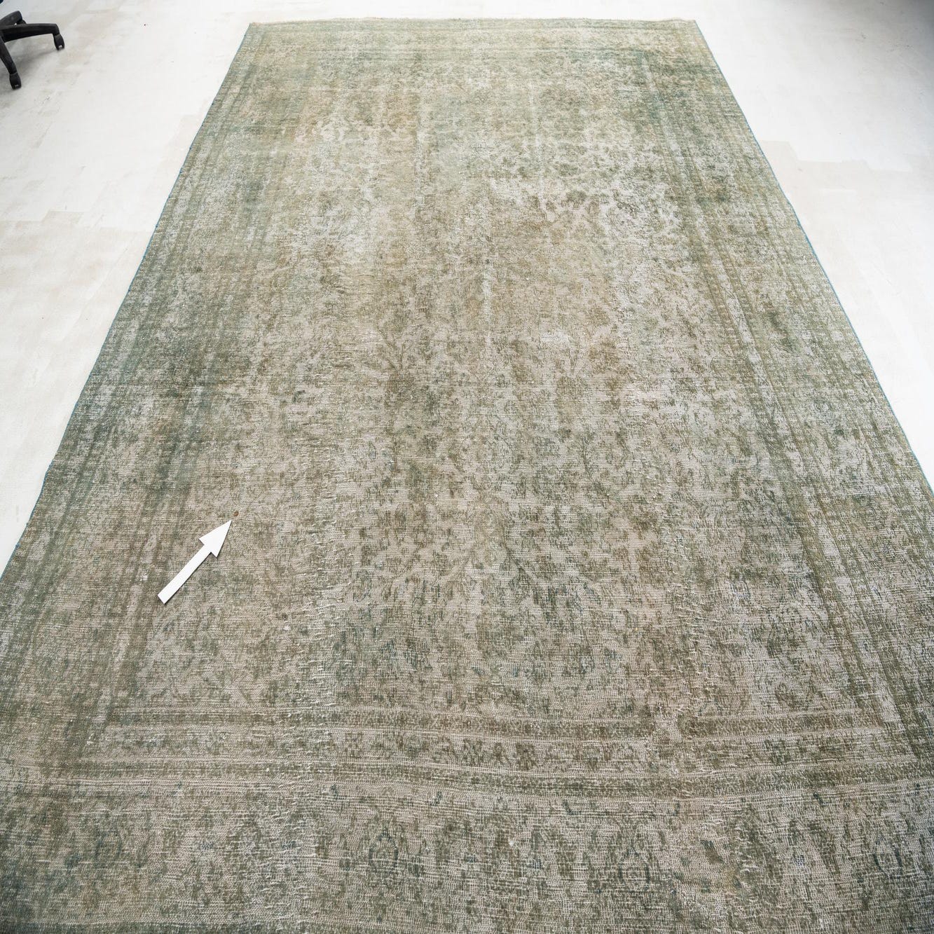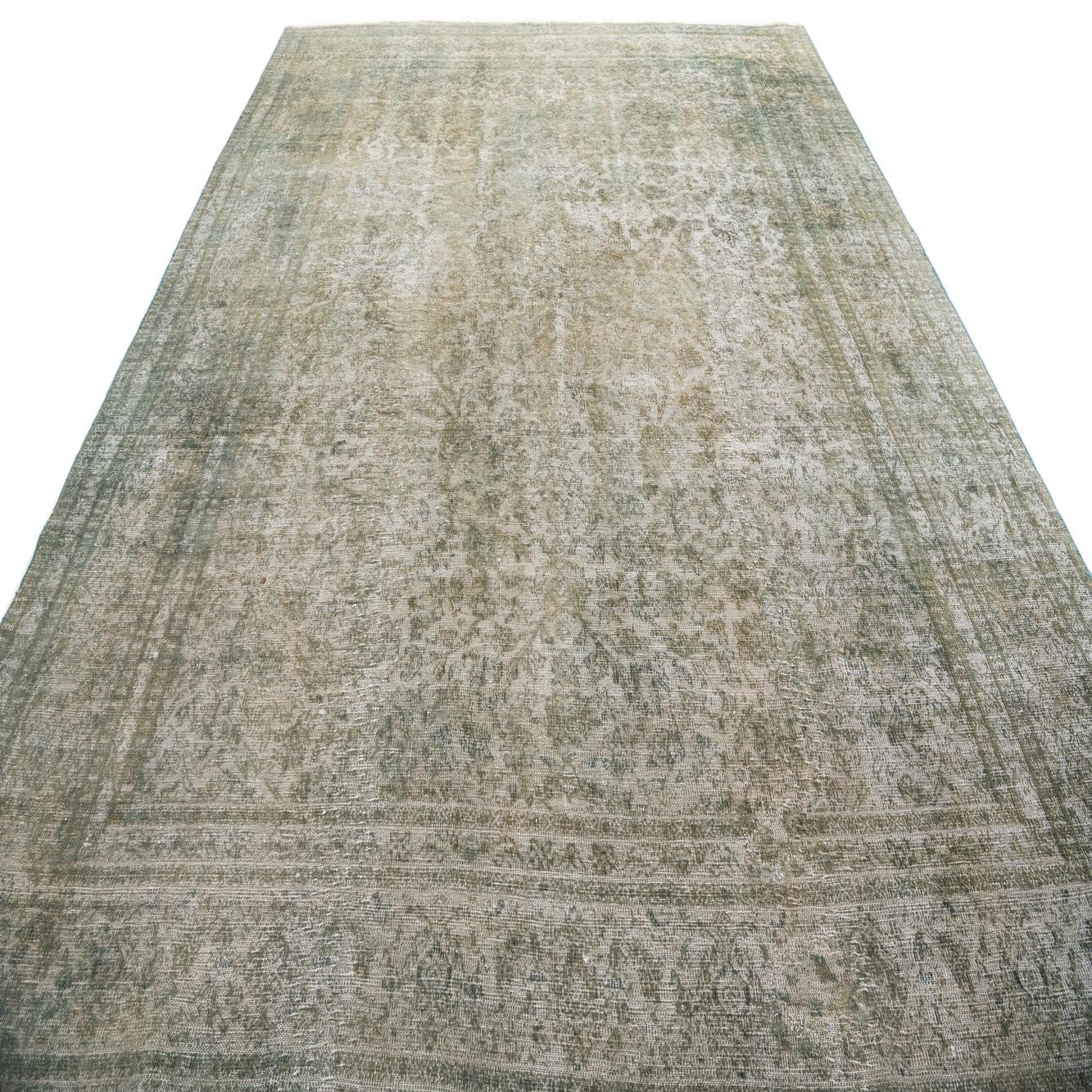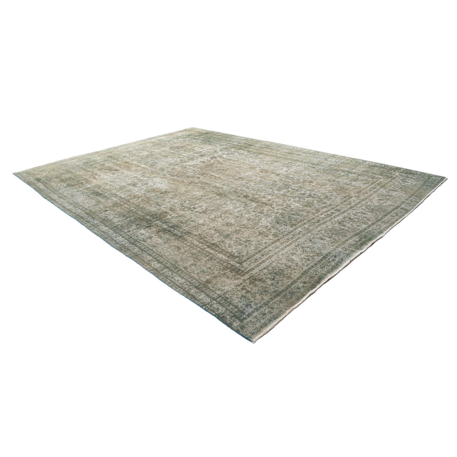 A large 9x12 rectangular Ultra Vintage rug with a faded green Persian medallion pattern and border.