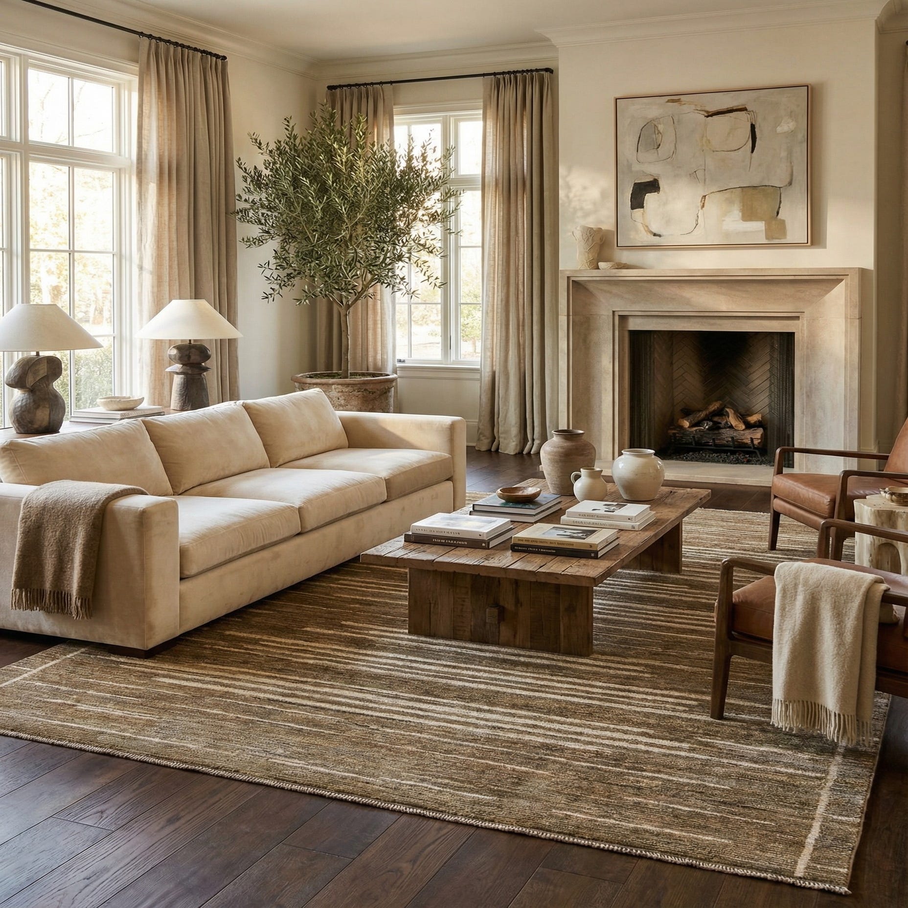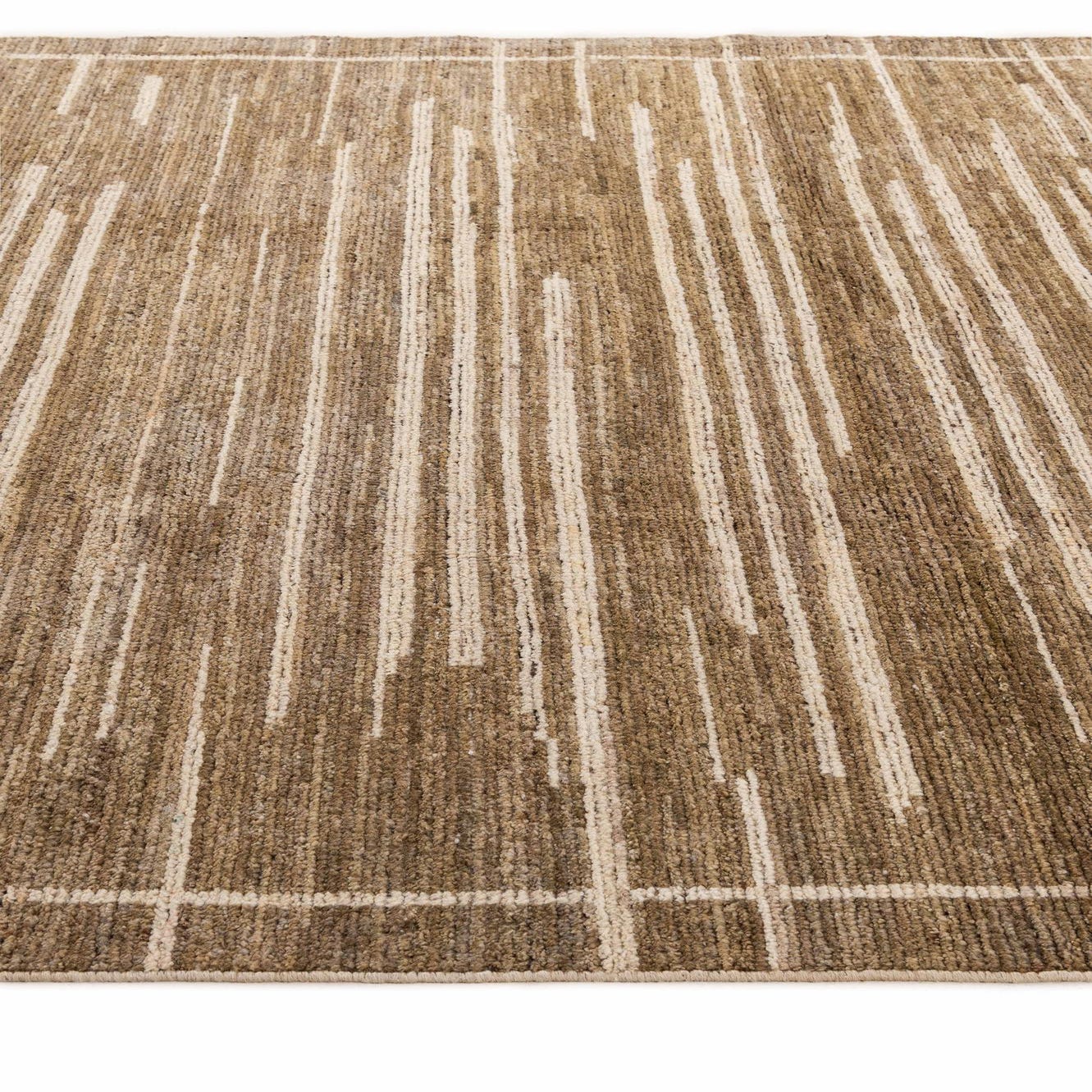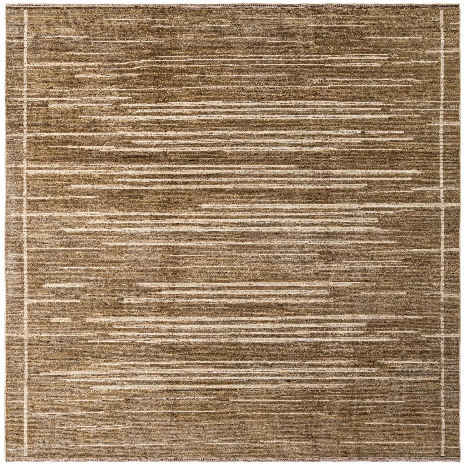 An 8x10 rectangular Darya rug in olive and cream, featuring a modern abstract striped pattern with a subtle border.