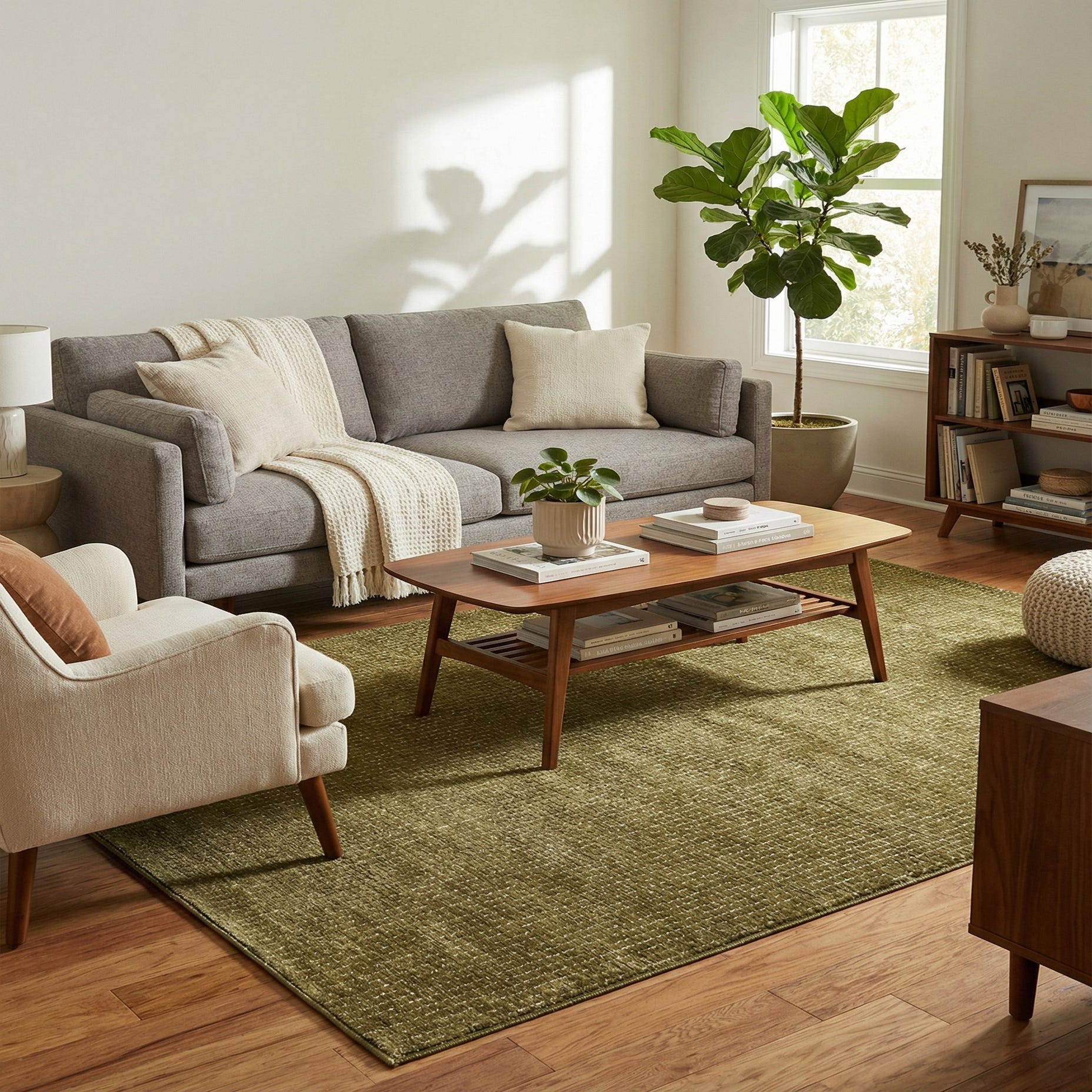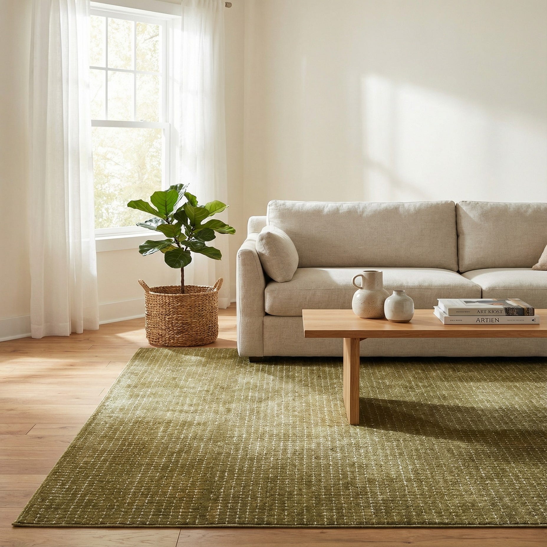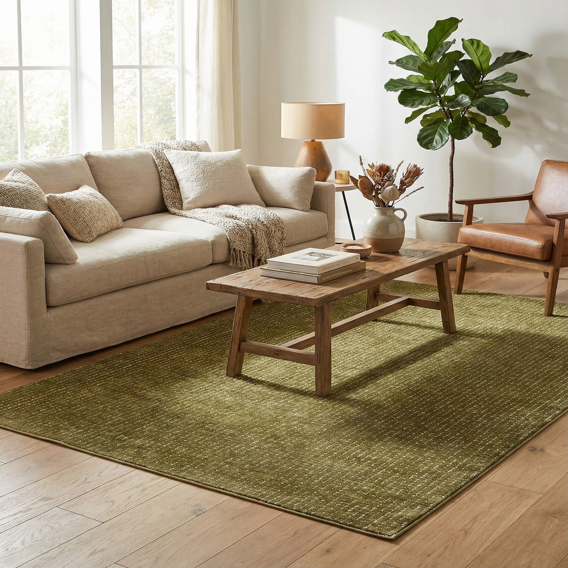 This rug works well in contemporary and transitional interiors where subtle texture and warm green tones are desired. Place it under a coffee table in a living room with natural wood and leather accents, layer it at the foot of a bed to introduce color without overpowering the scheme, or use it in a home office to add tactile warmth alongside brass or matte black hardware. Its muted pattern pairs nicely with botanical accents, woven textiles, and mid-century silhouettes.