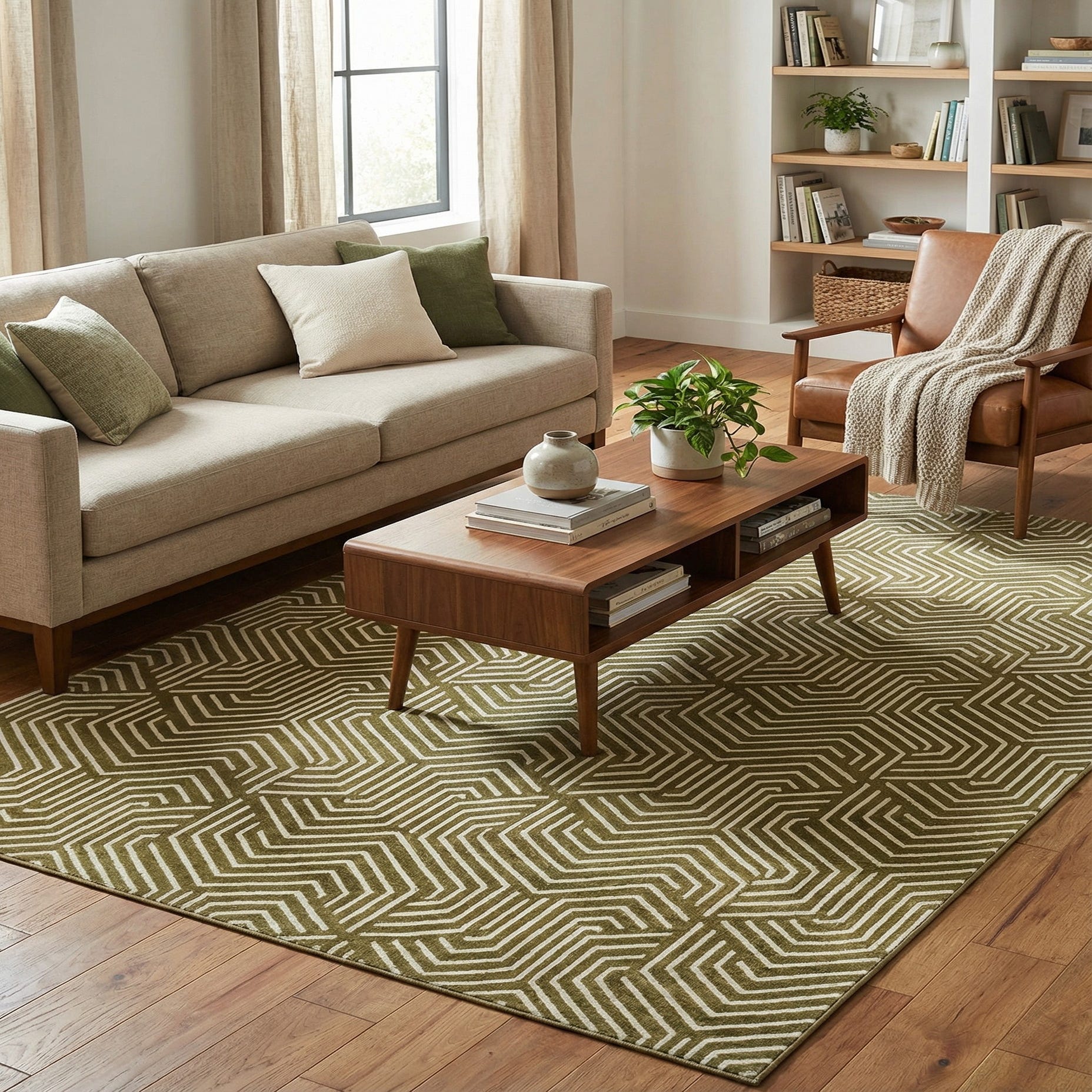 A rectangular 5x8 olive green area rug with a repeating geometric pattern of white interlocking lines, suitable for various indoor rooms.