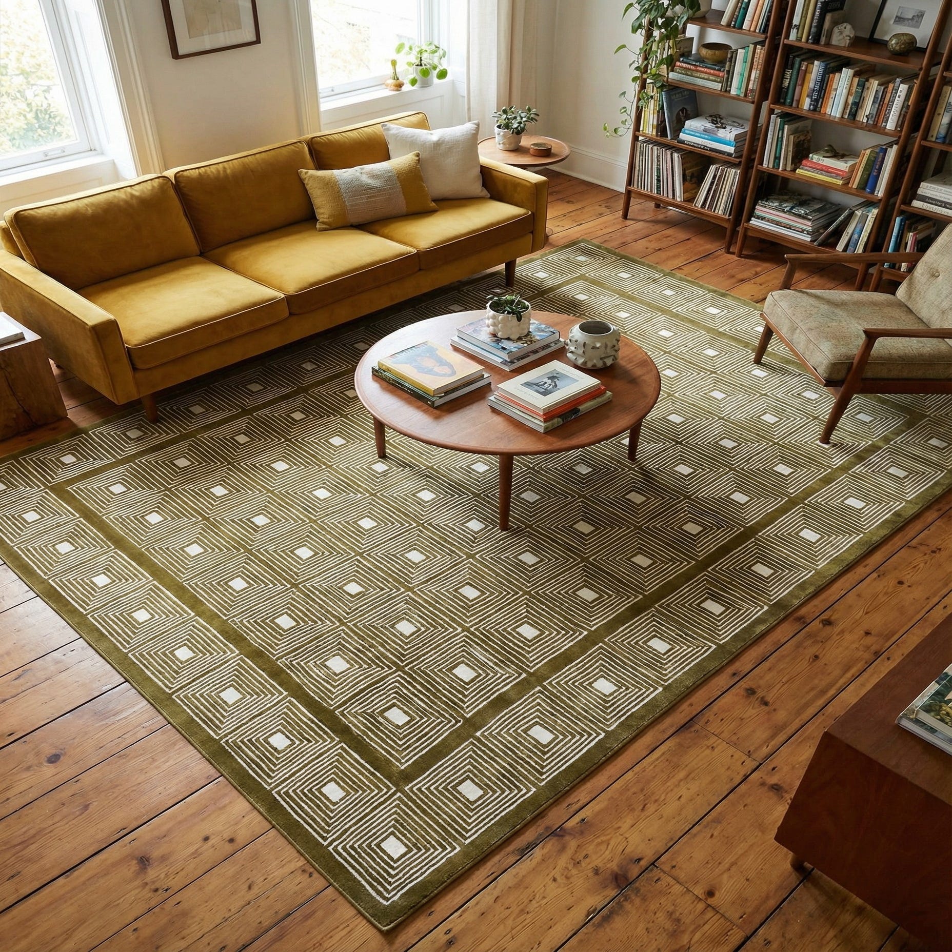 This rug works well in contemporary and mid-century modern interiors, anchoring a living room seating area or adding pattern beneath a dining table. It pairs nicely with warm wood tones, neutral upholstery, and brass or matte black metal accents, and also complements a layered, transitional scheme where clean lines meet textured textiles. Its graphic layout makes it a strong choice for a home office or entryway where you want a bold, organized look without overwhelming the space.