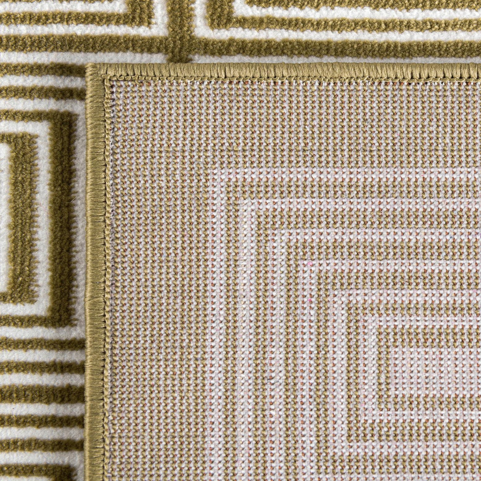 A structured grid of concentric squares brings a crisp, modern rhythm to an olive green ground, the ivory lines carving a clean geometric pattern across the surface. The repeating square motif and a framed border create visual order while the alternating line weight adds subtle depth. Machine-made construction in 85% polypropylene and 15% chenille gives the rug a low-profile, dense weave with soft chenille accents that feel velvety underfoot and show a gentle sheen as you move around the room.