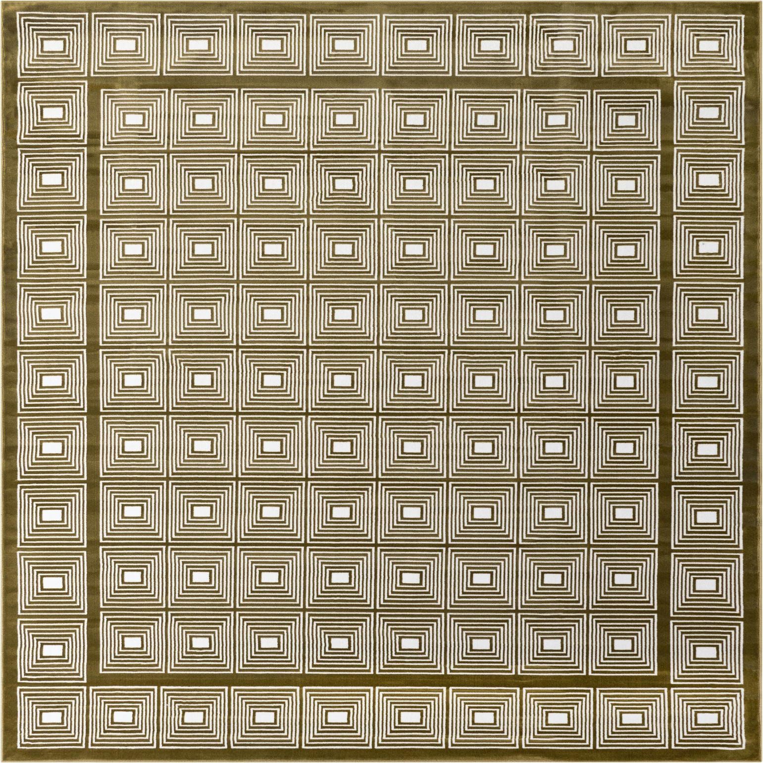 An 8x10 rectangular olive green modern rug with a repeating white concentric square pattern and border.