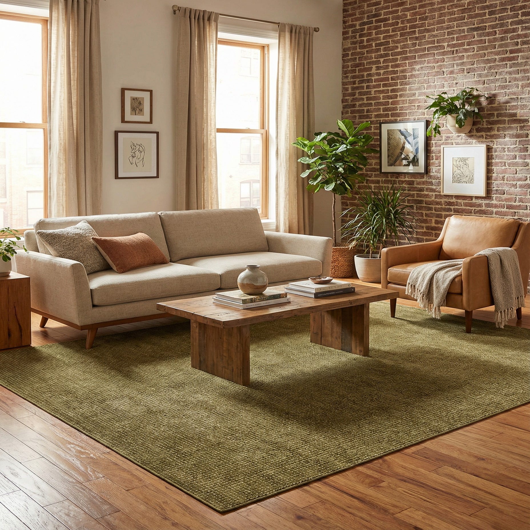 The muted olive and ivory palette works well with contemporary, mid-century, and rustic-modern schemes. Use it to anchor a living room seating area, warm up a dining space, or layer beneath a bed for added texture. Pair with natural wood finishes, leather or linen upholstery, and warm metal accents to emphasize the rug’s earthy tone and tactile character.