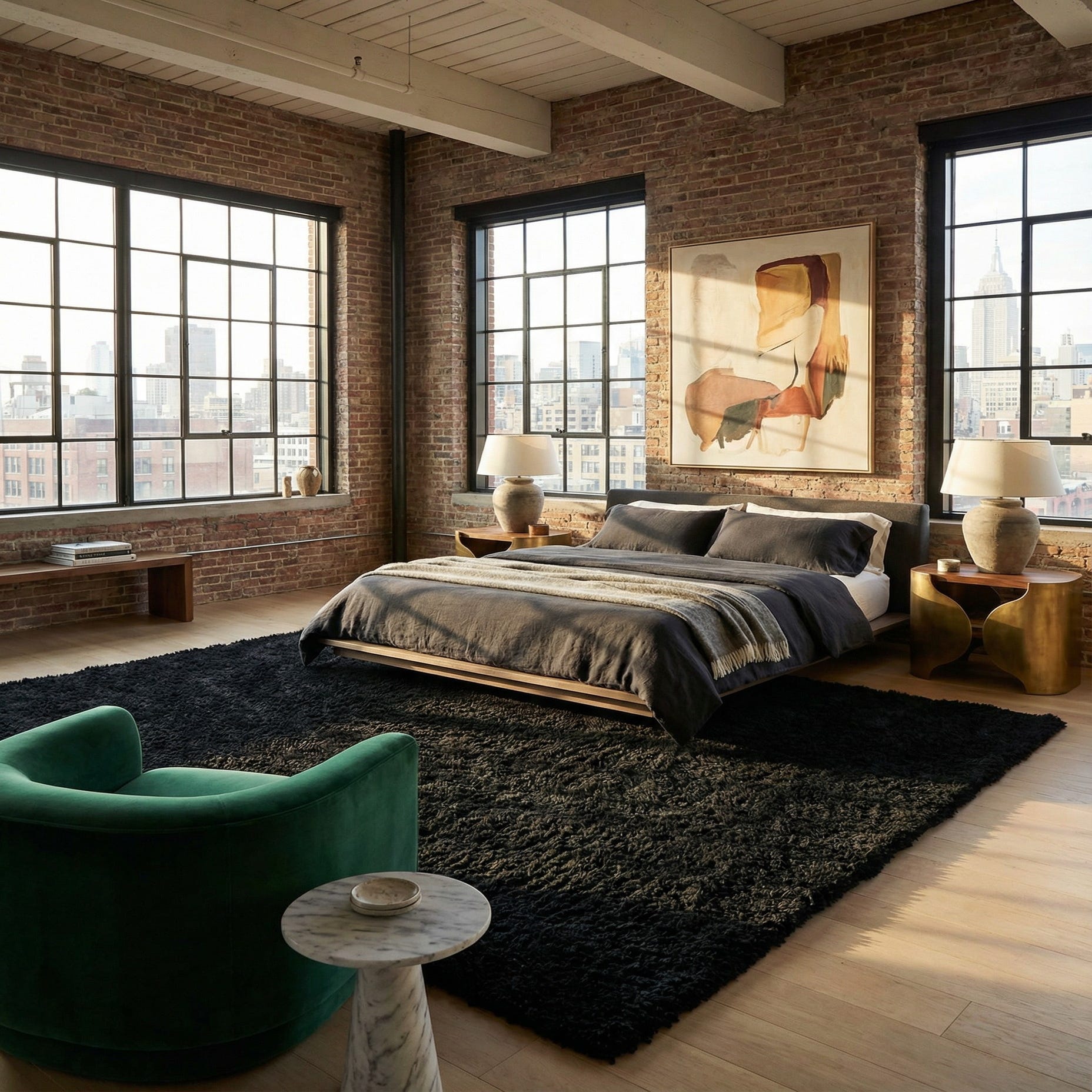 This piece fits well in contemporary, minimalist, or modern transitional spaces. Use it to ground a living room seating group, add depth and comfort to a media room, or layer under bedroom furniture to create contrast against lighter floors. It pairs cleanly with neutral schemes, crisp white or greige walls, and can also provide a dramatic backdrop for brass or chrome accents and richly textured upholstery.