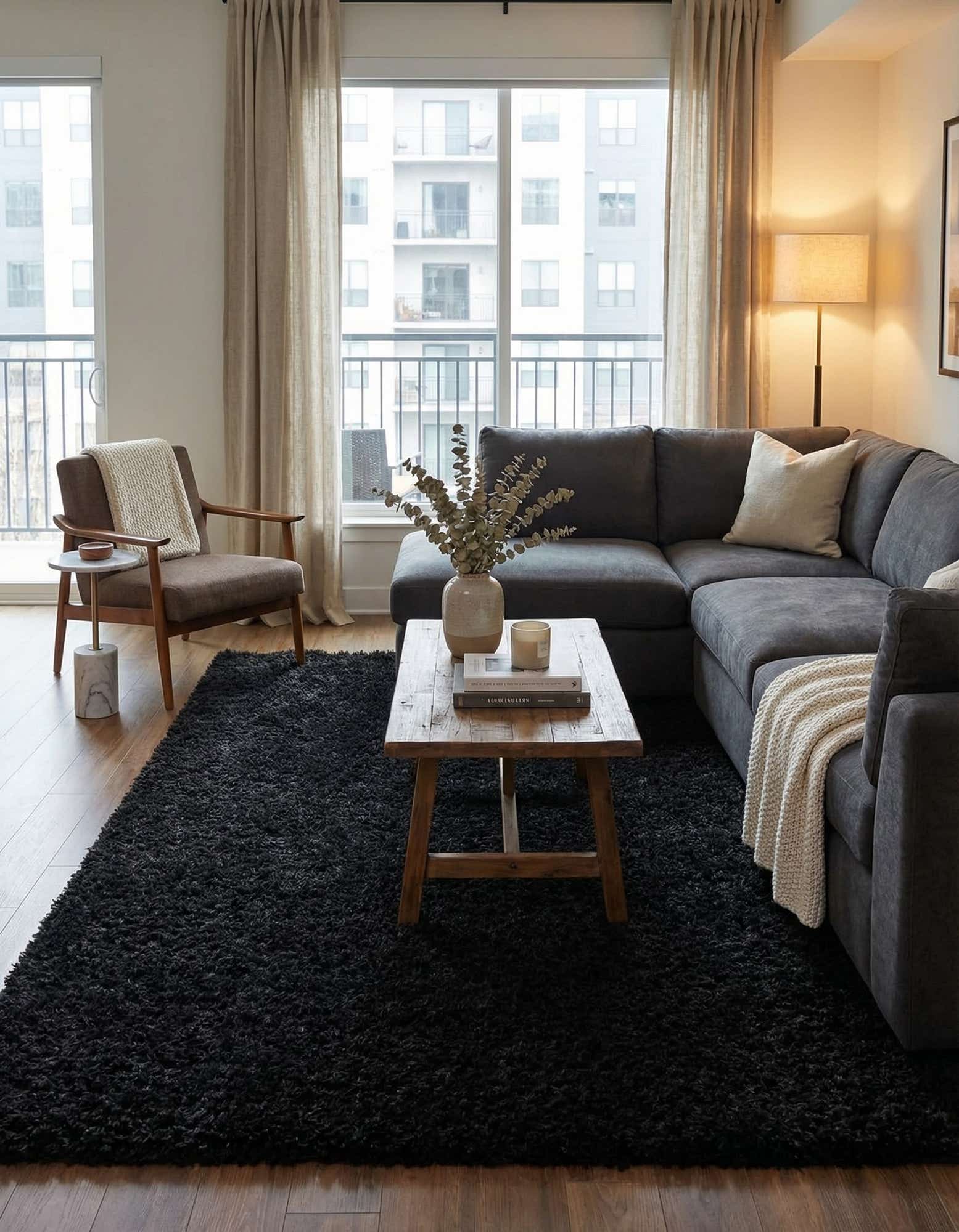 Use this solid black shag to anchor contemporary seating areas, add warmth beneath a low coffee table, or place it in a bedroom to create a dramatic, grounding layer against lighter bedding and walls. It pairs well with pale neutrals and metallic accents for high contrast, or with deep jewel tones for a more layered, sophisticated palette; the clean, single-color look also complements industrial and minimalist interiors that favor simple, bold elements.