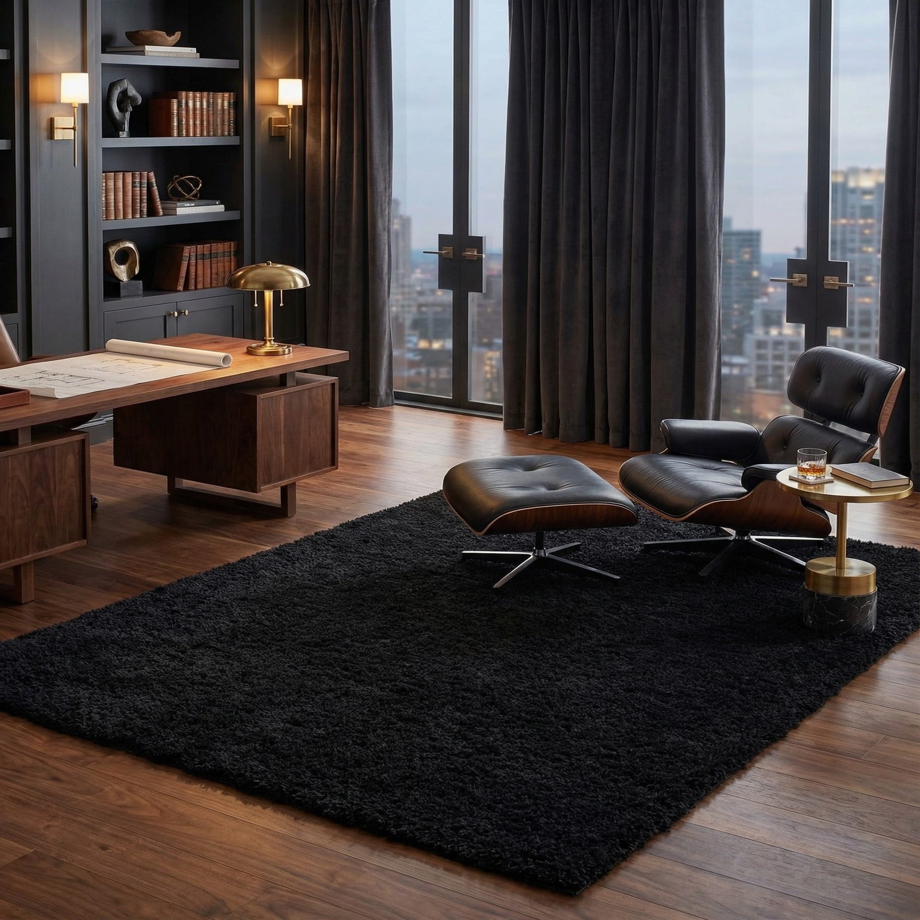 A solid, monochrome surface in Onyx Black is rendered in a dense, long shag pile that reads clean and modern. The rug is machine-made from 100% polyester, producing an even, plush texture that invites touch — the fibers feel soft and springy beneath your hand and provide a deep, cushiony underfoot sensation. There’s no printed or woven motif; the design is purely about pile and color, offering a rich, consistent field of black that adds visual depth through its high pile.