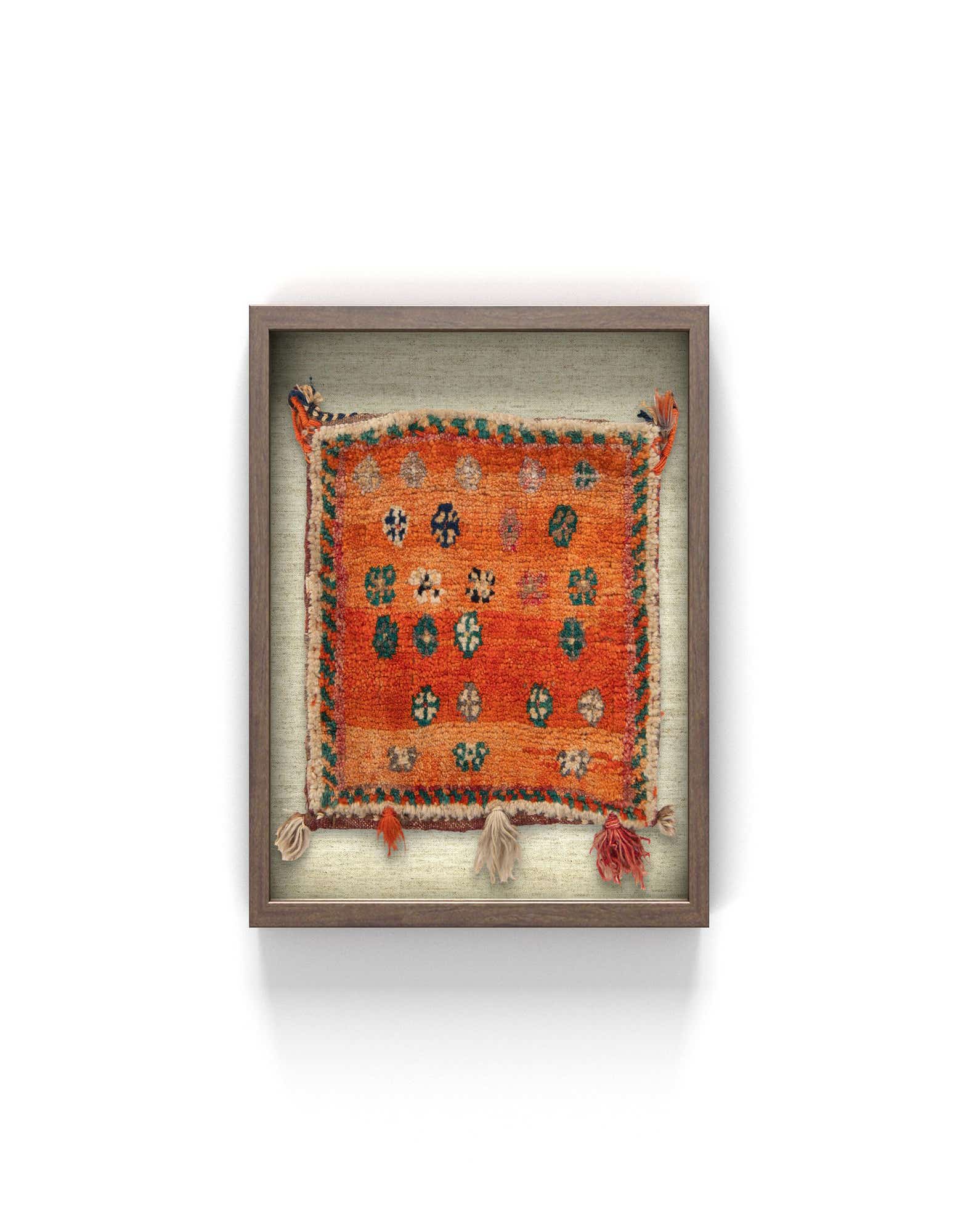 Primary color is Orange. Colors in this rug include: Orange, Green, Ivory, Navy Blue.