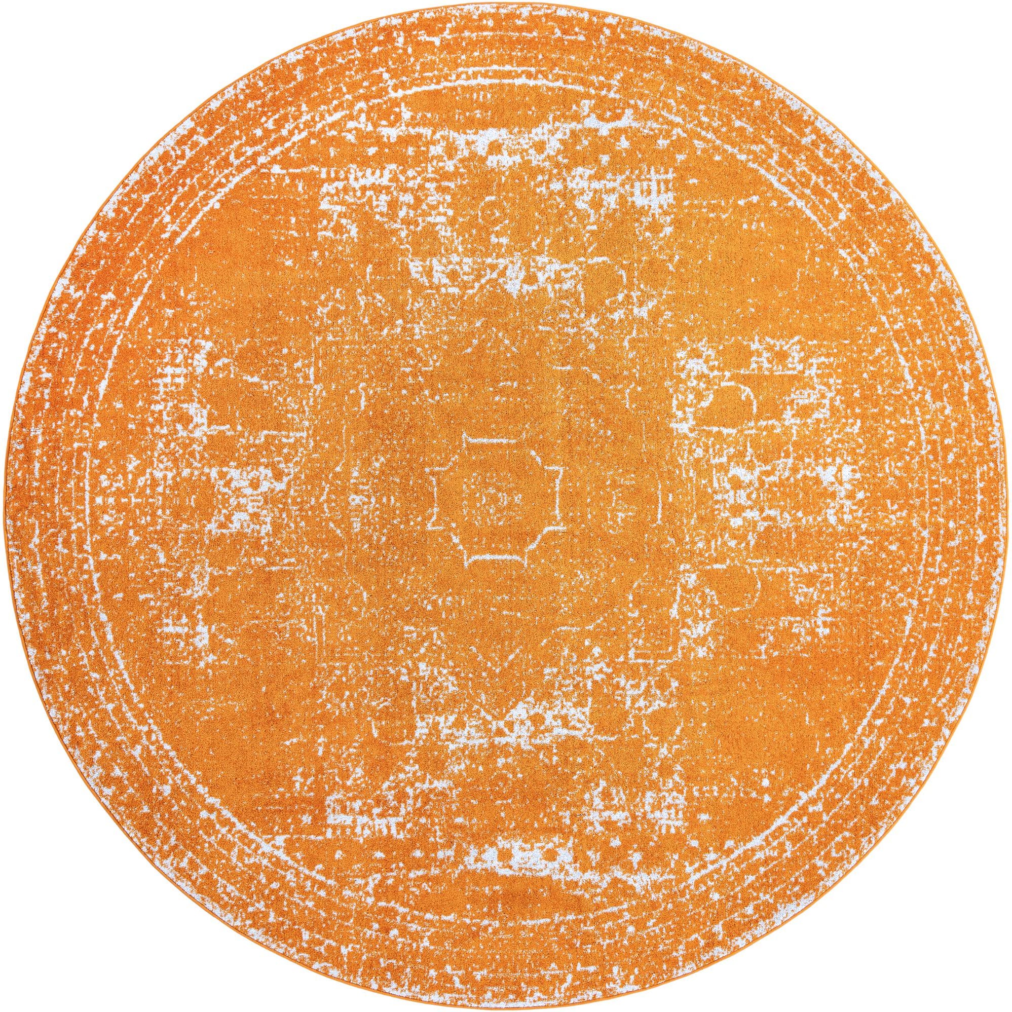 A 10-foot round orange rug with a distressed, faded white traditional pattern, suitable for a patio.