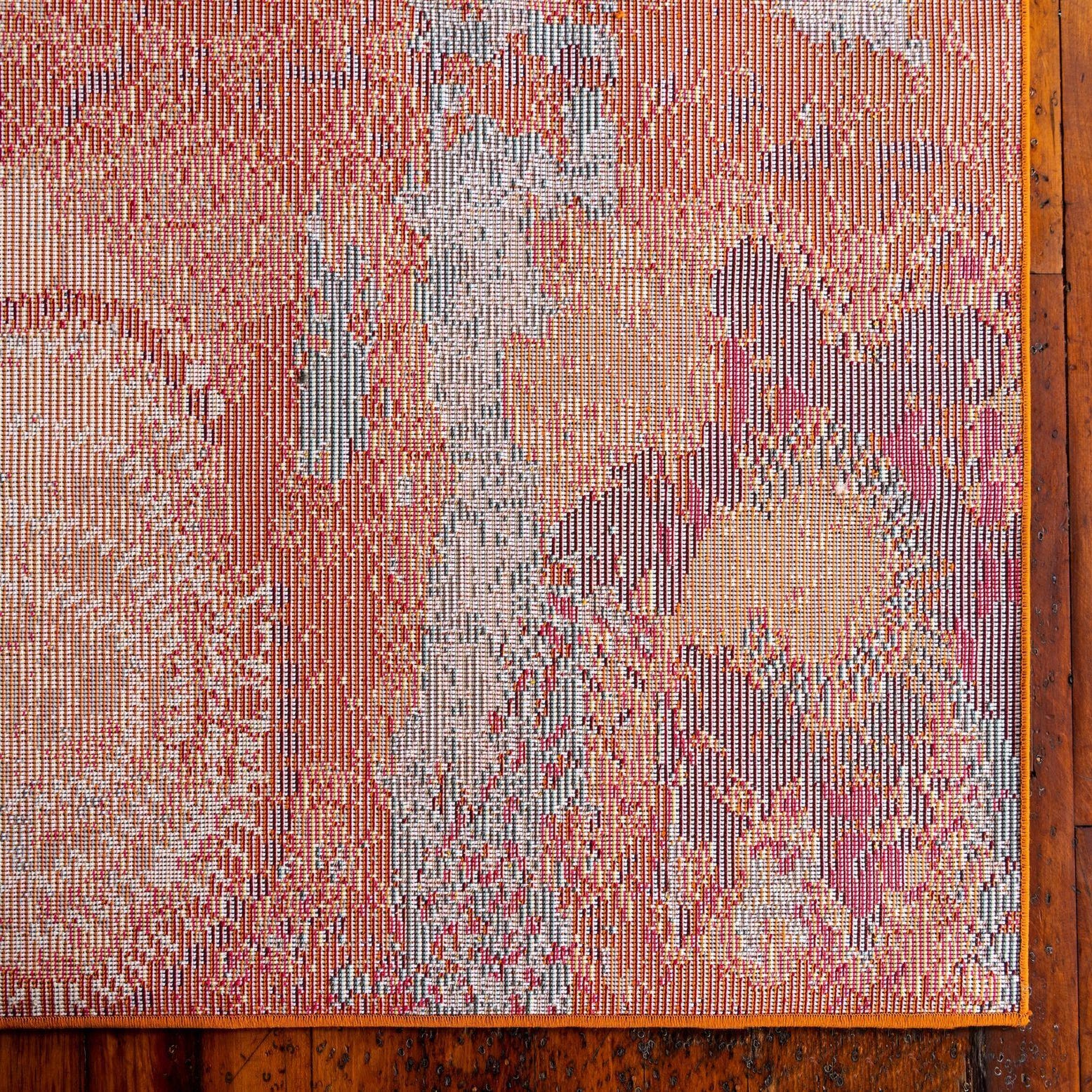 Primary color is Orange. Colors in this rug include: Orange, Beige, Brown, Burgundy, Gray, Red, Terracotta, Light Blue.