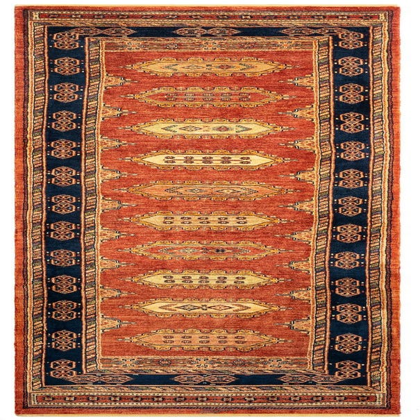 Primary color is Orange. Colors in this rug include: Orange, Orange, Beige, Dark Blue, Yellow.