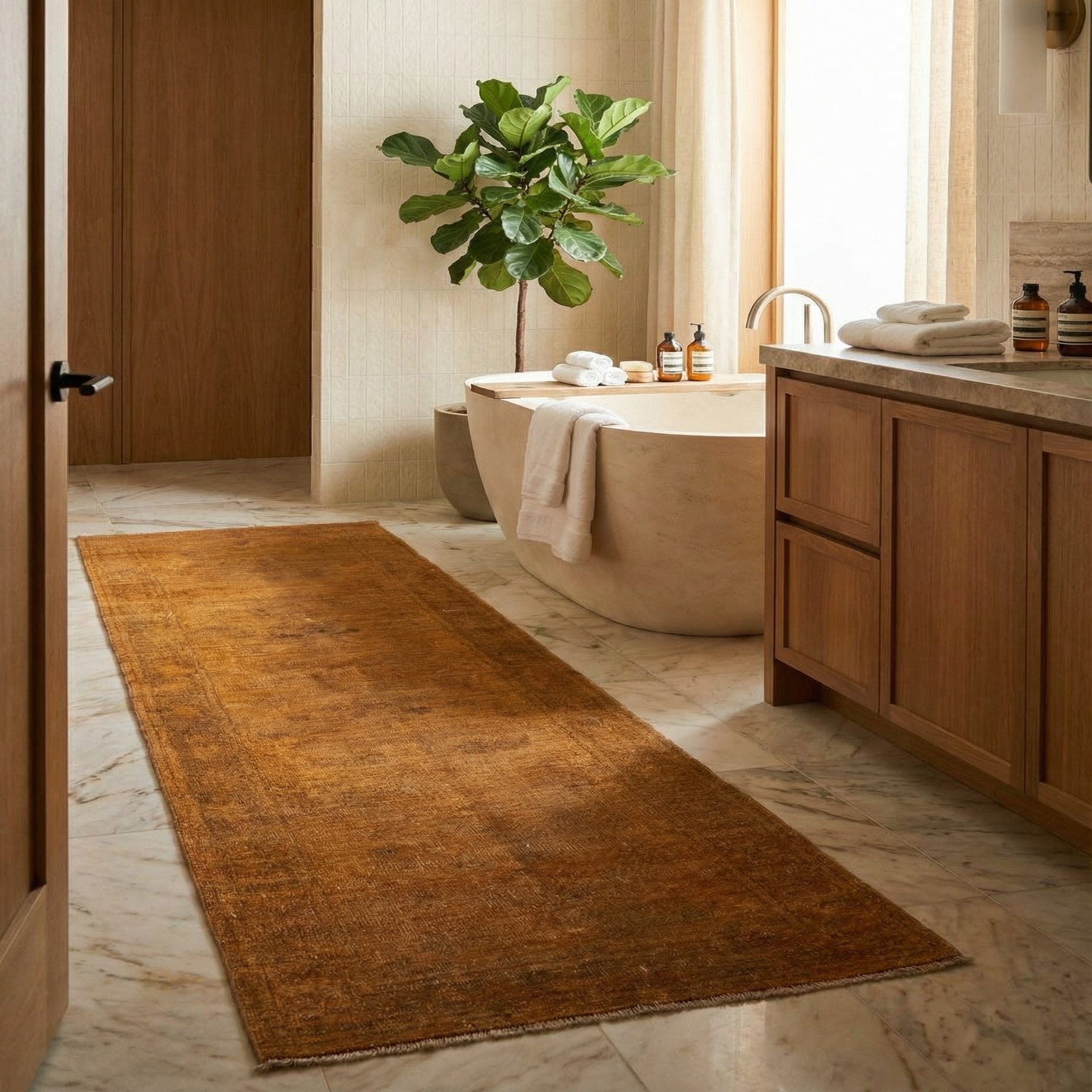 With its muted yet inviting palette, this runner is versatile, suitable for a variety of interior designs. It aligns effortlessly with natural wood elements, leather furnishings, and an earth-toned color scheme to reinforce an organic, grounded aesthetic. Alternatively, it can serve as a warm counterpoint in minimalist or contemporary settings, offering a sense of balance and visual interest against sleek, modern lines. The runner's size and style make it an ideal addition for hallways, entryways, or alongside a grand dining table, where it would provide both a visual pathway and a cohesive design element.