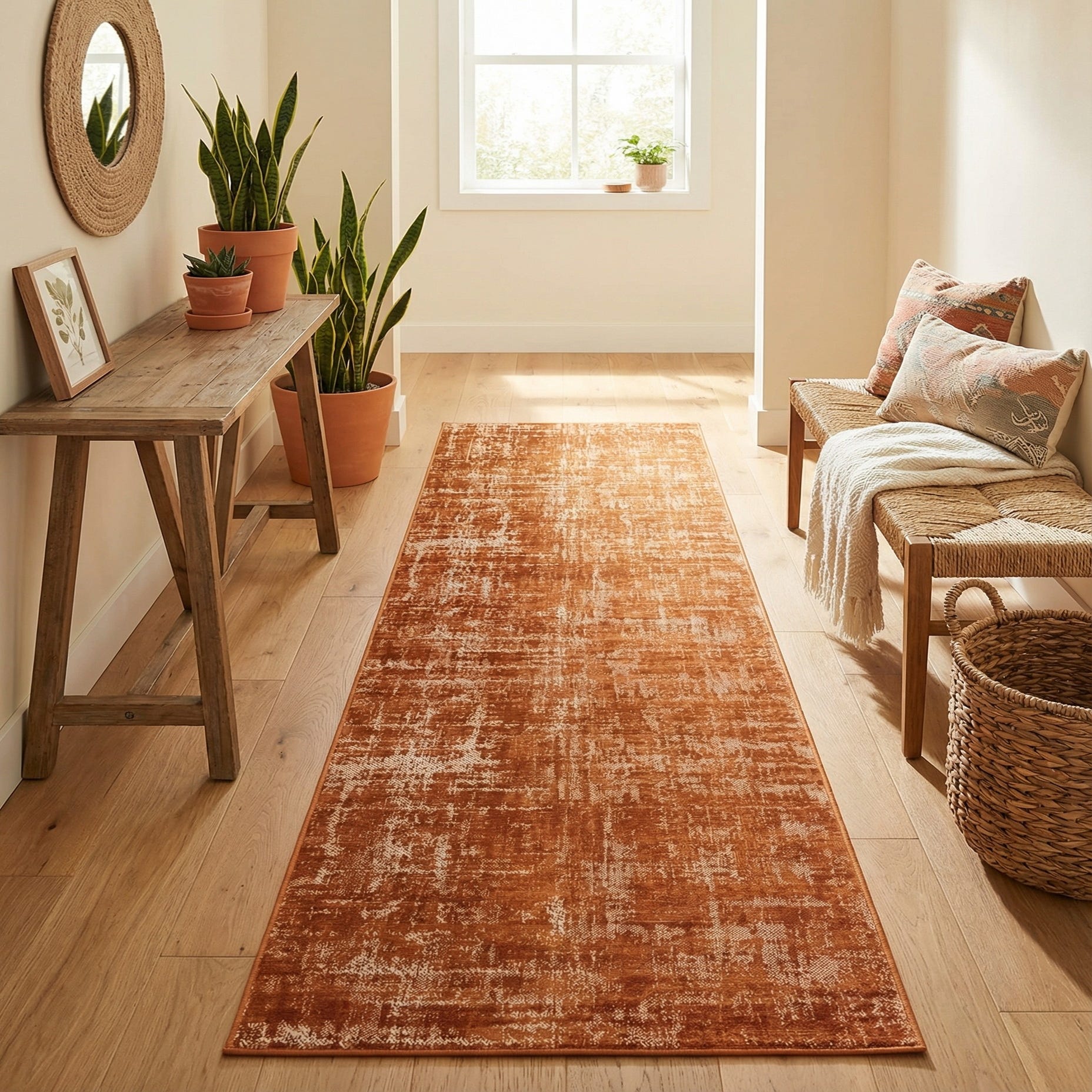 A 10 ft orange runner rug with a distressed, abstract pattern in shades of rust and cream, perfect for a hallway.