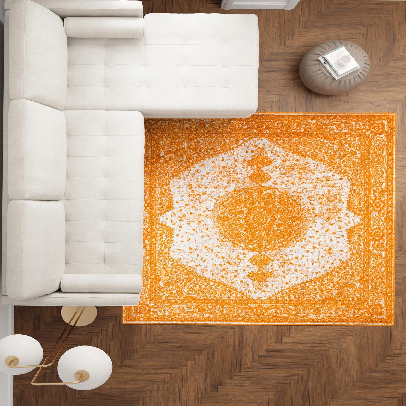 A vibrant orange ground sets the stage for a classic medallion layout rendered in ivory, giving this square rug a fresh, modern take on a traditional Persian motif. The field and border carry a deliberately distressed finish that softens the contrast between the colors and reveals delicate floral and trellis details. Machine made of 100% polypropylene, the pile is low-profile with a smooth, slightly dense hand where the orange fibers form the pattern against the ivory background, offering a tactile, subtly textured surface underfoot.