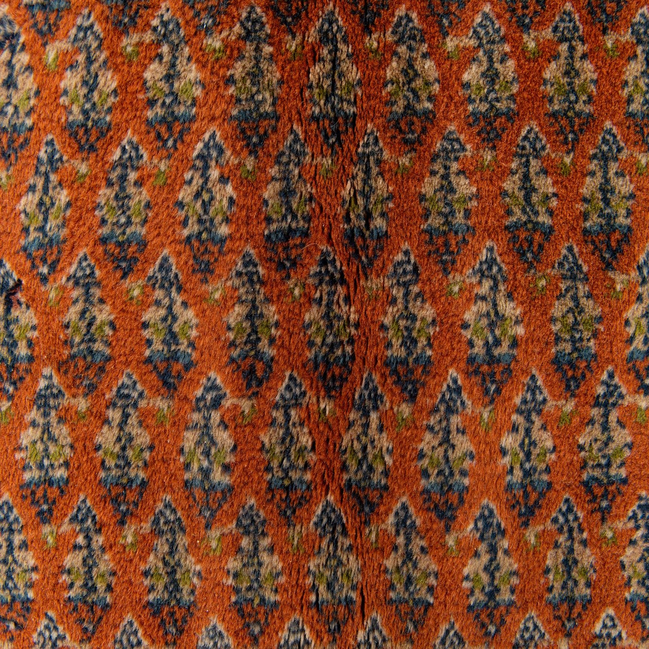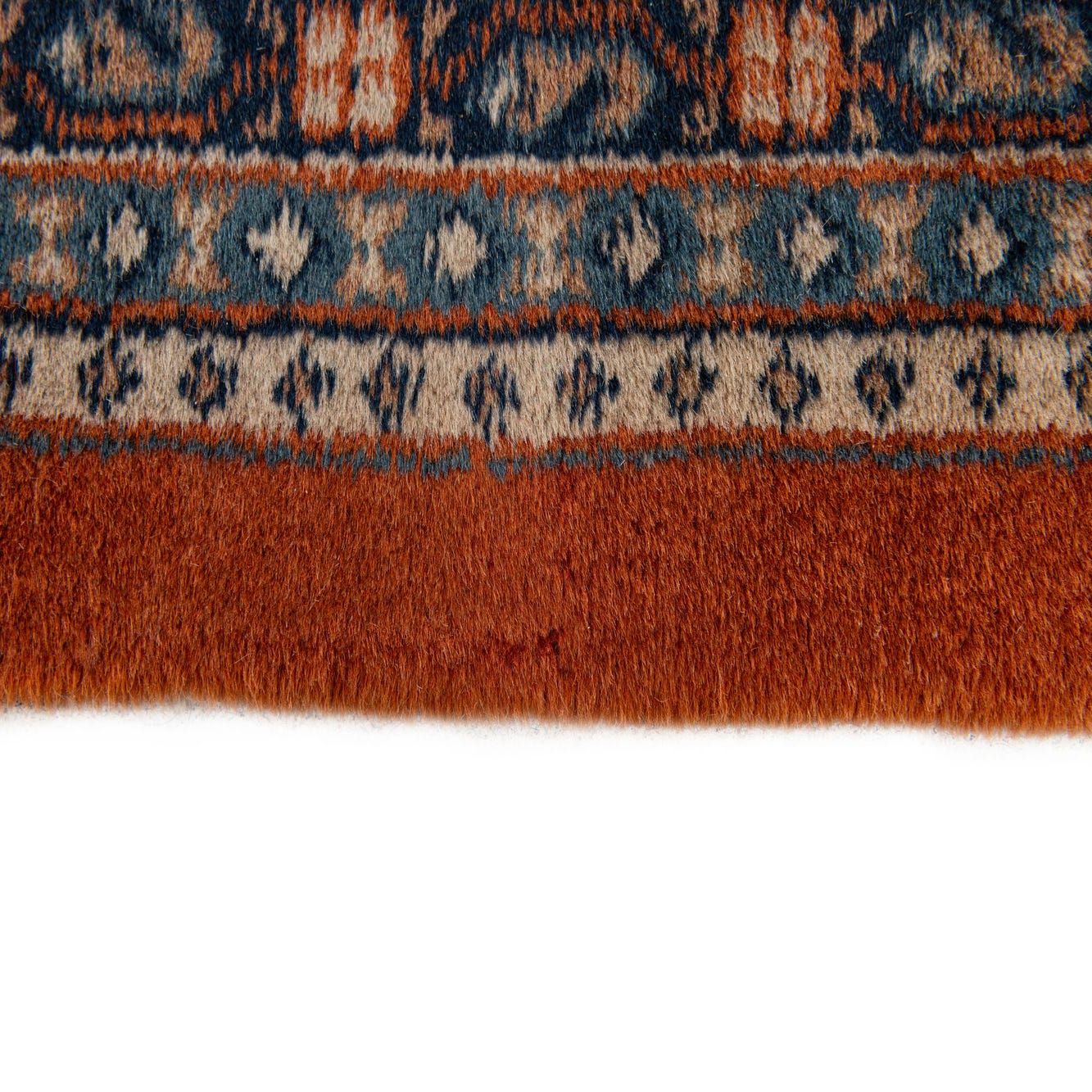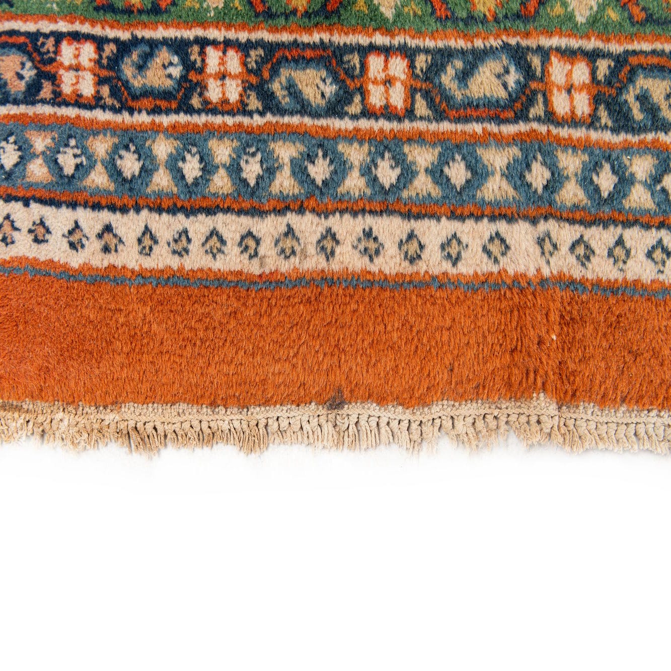 Primary color is Orange. Colors in this rug include: Orange, Blue, Gold, Green, Ivory, Navy Blue.