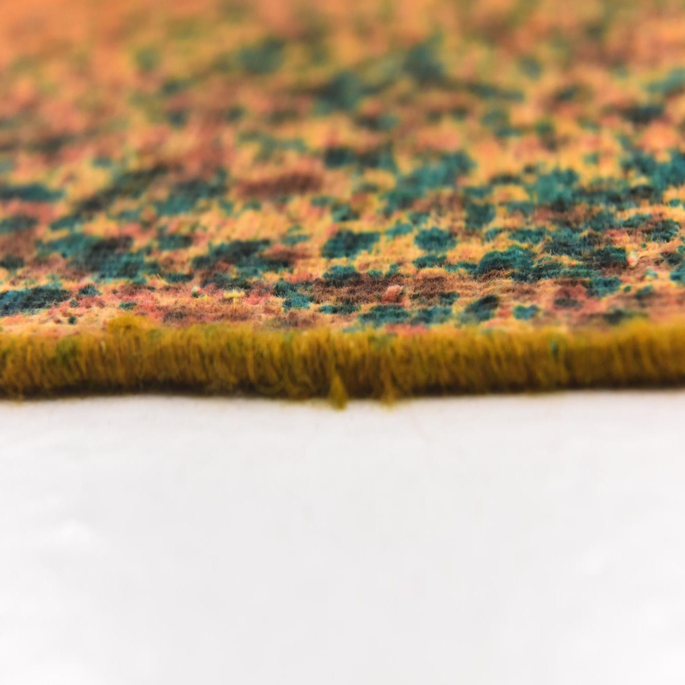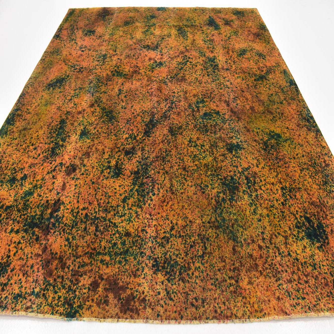 The Ultra Vintage Collection offers a unique 10 Ft Square rug that is hand-knotted of 100% wool, promising lasting durability and a soft underfoot experience. This particular rug features a bold orange background that is harmoniously complemented by accents of green and terracotta, creating a vibrant yet earthy palette. The rug's pattern is suggestive of an organic texture, reminiscent of vintage patina, which adds depth and character to the piece.
