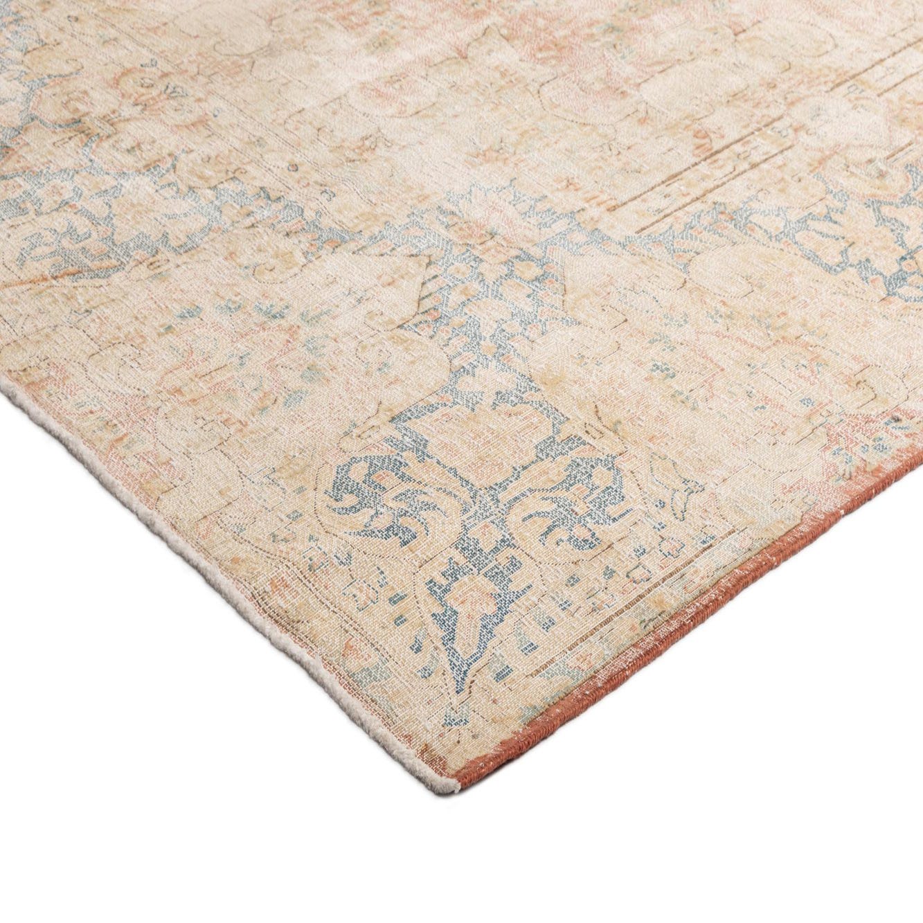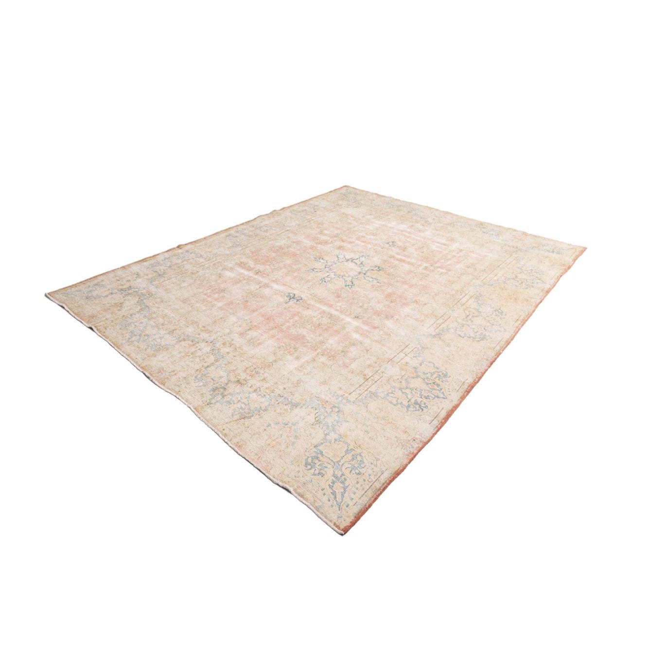 Beige, light blue, white, and light red shades intricately weave through the design, creating a sense of harmony and balance. The crisp definition between the colors accentuates the rug's detailed motifs and gives it a distinct vintage appeal. The texture, inherent to hand-crafted wool pieces, is robust yet soft underfoot, ensuring a tactile experience that complements the visual aesthetics.