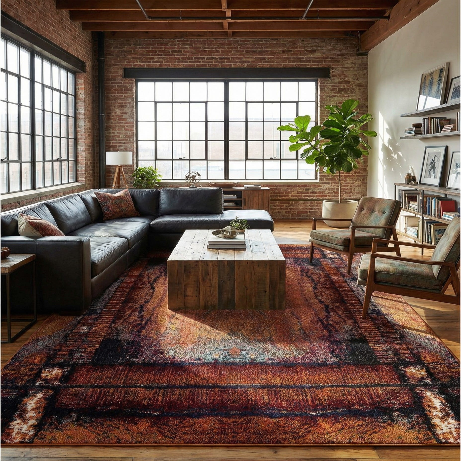 Machine-made from 100% polypropylene, the rug has a low-pile, smooth hand that feels comfortable underfoot while maintaining a structured appearance. It pairs naturally with warm wood and leather — think a living room with a mid-century sofa and metal-accented coffee table — and also complements industrial or eclectic spaces where layered color and texture are welcome. Use it to define an open-plan seating area, anchor a dining table, or add bold color at an entry or home office for an immediate design focus.