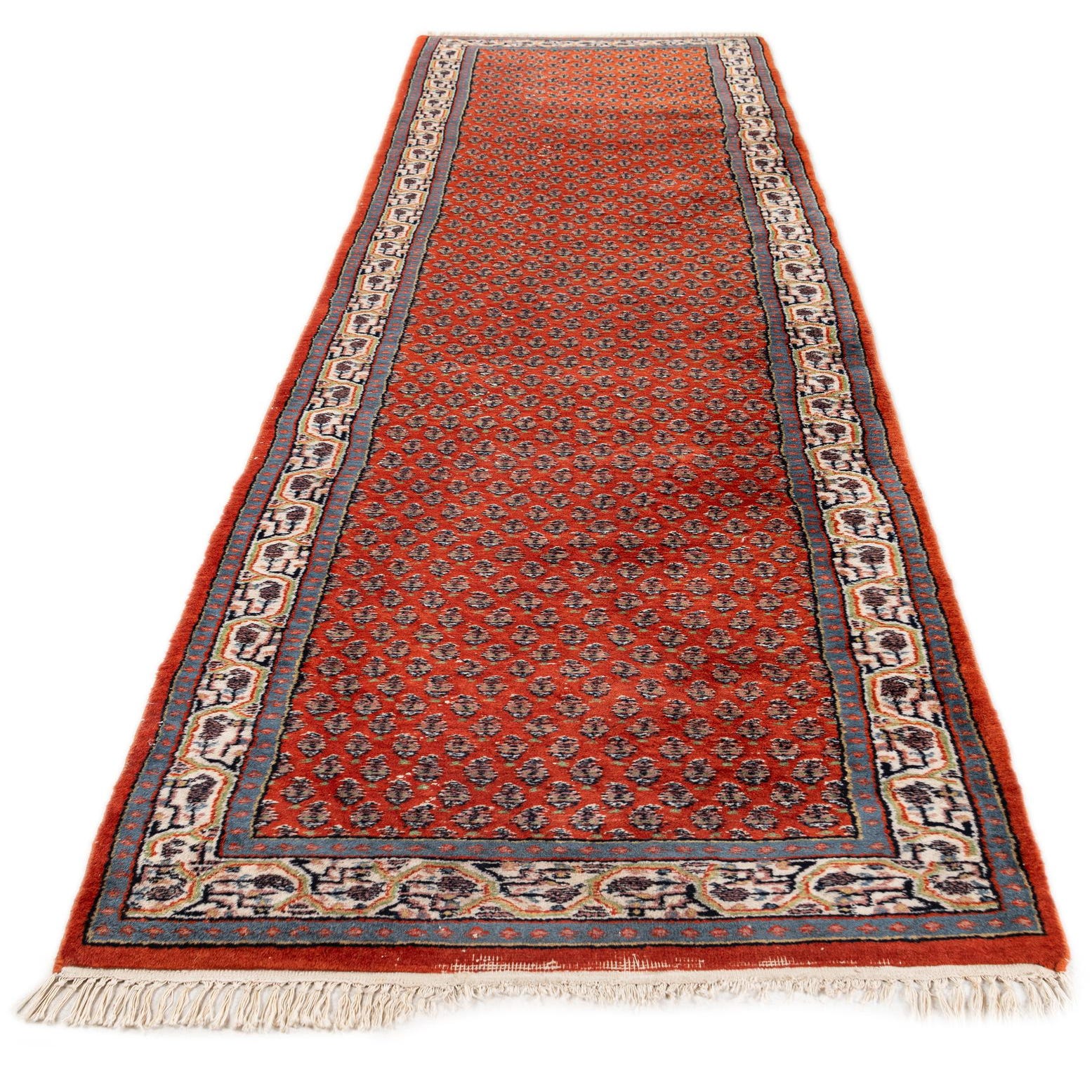 A handmade 11 ft Mir runner rug in traditional Oriental style, featuring a vibrant orange field with repeating floral motifs and a detailed border.