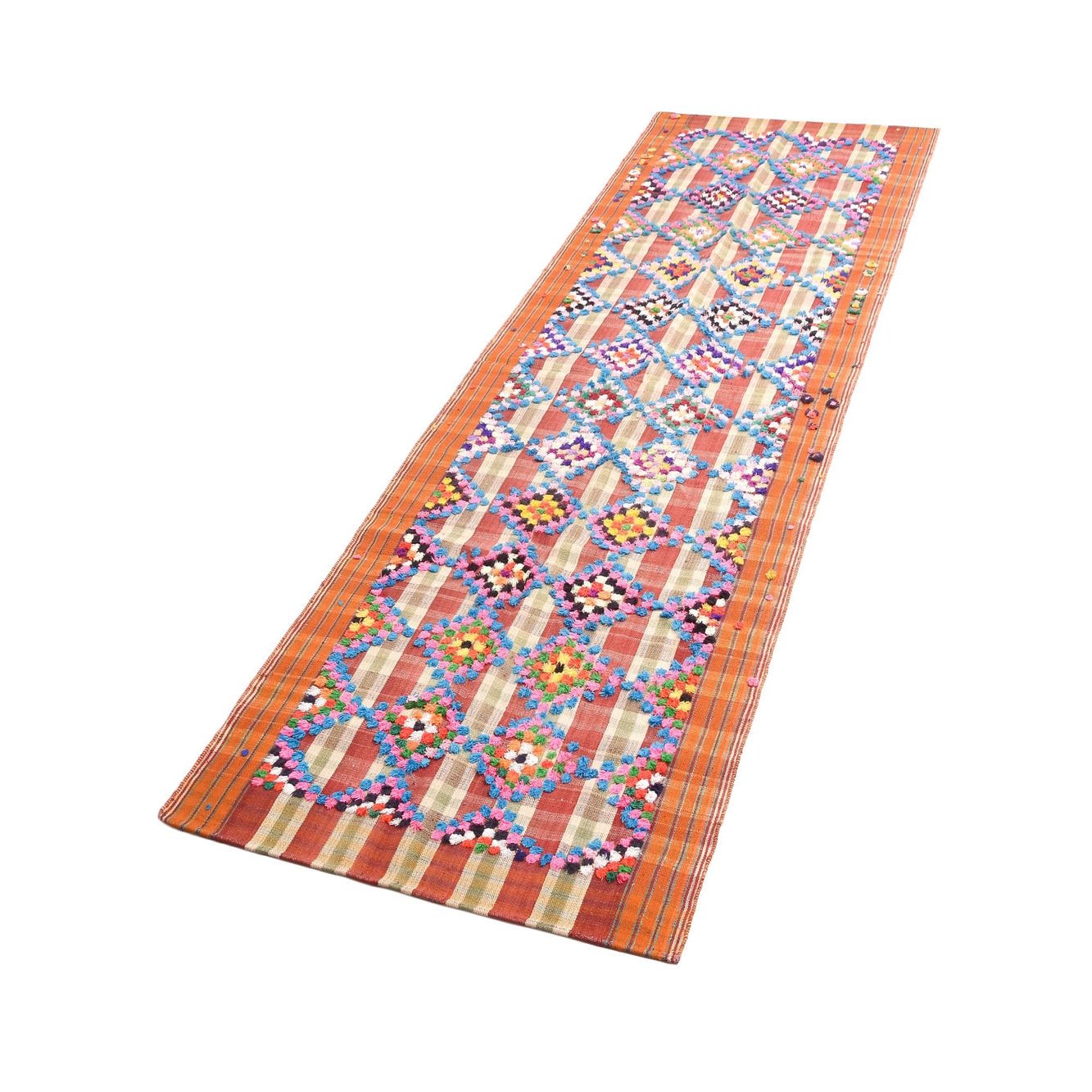 A 12 ft Jajim runner rug with a plaid background in oranges and beige, featuring colorful Persian-style diamond patterns.