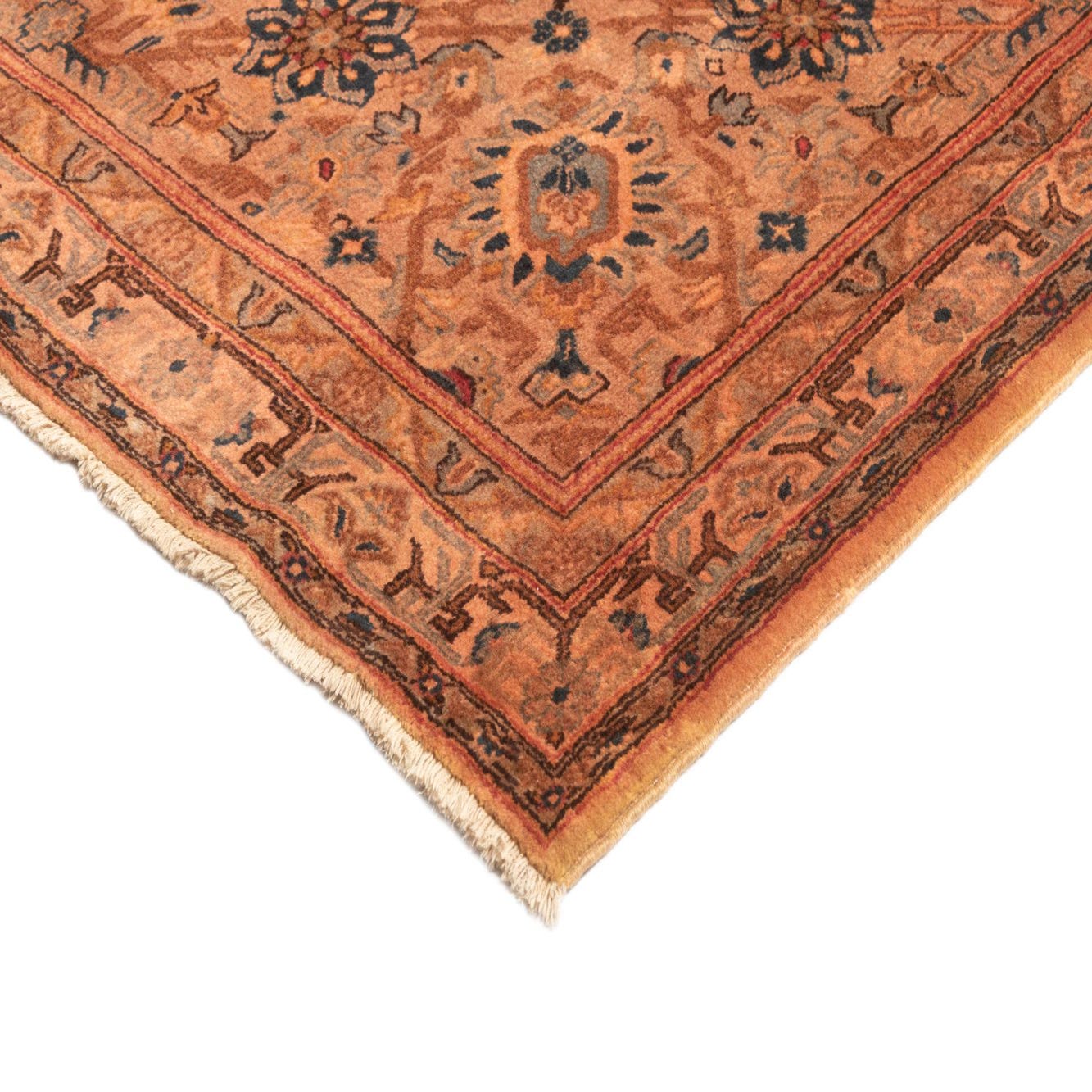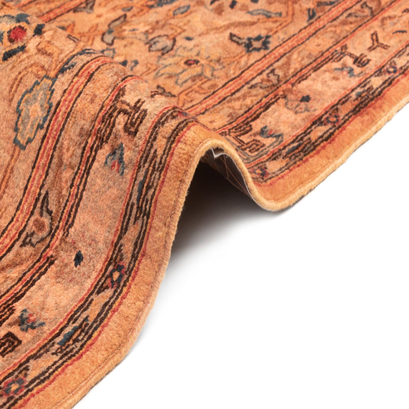 This hand-made wool rug presents a traditional oriental layout with an intricate allover pattern of vines, palmettes and floral motifs set within multiple inner and outer borders. The field is a warm orange that provides a luminous backdrop for the design elements in brown, red, yellow and touches of blue. Running your hand across the surface, you feel a dense, low-to-medium pile with a supple woolen texture and a soft natural luster; the detailed knotting creates fine linework and a gently softened contrast between colors that gives the piece a calm, collected presence.
