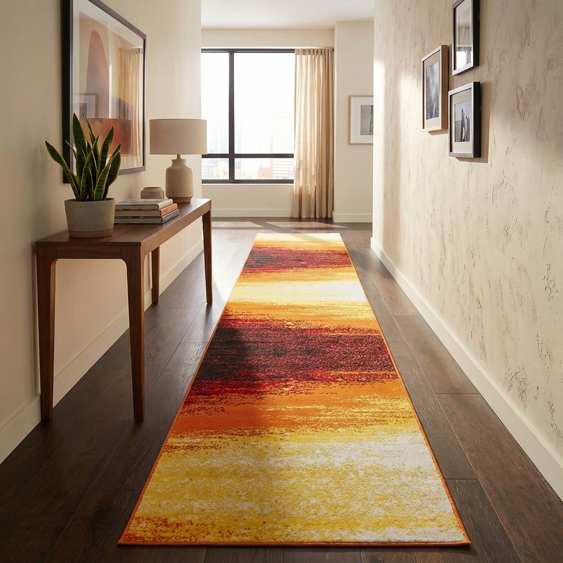 A bold, painterly runner with an orange ground that carries layered bands of yellow, ivory, peach, red and deep black. The pattern is abstract and directional, like broad brushstrokes and fine speckling blended along the length to create movement and depth. Machine-made in 100% polypropylene, the pile is dense and low to medium in height, offering a smooth, slightly cushioned hand beneath your feet and a tidy, tailored edge.