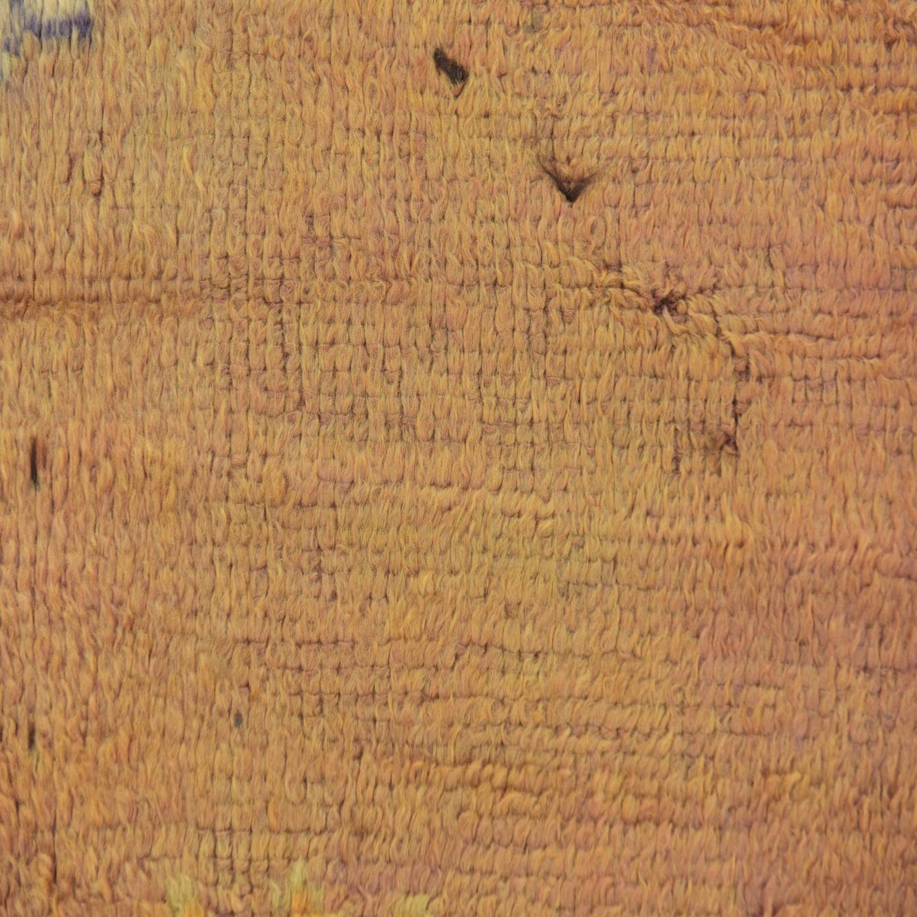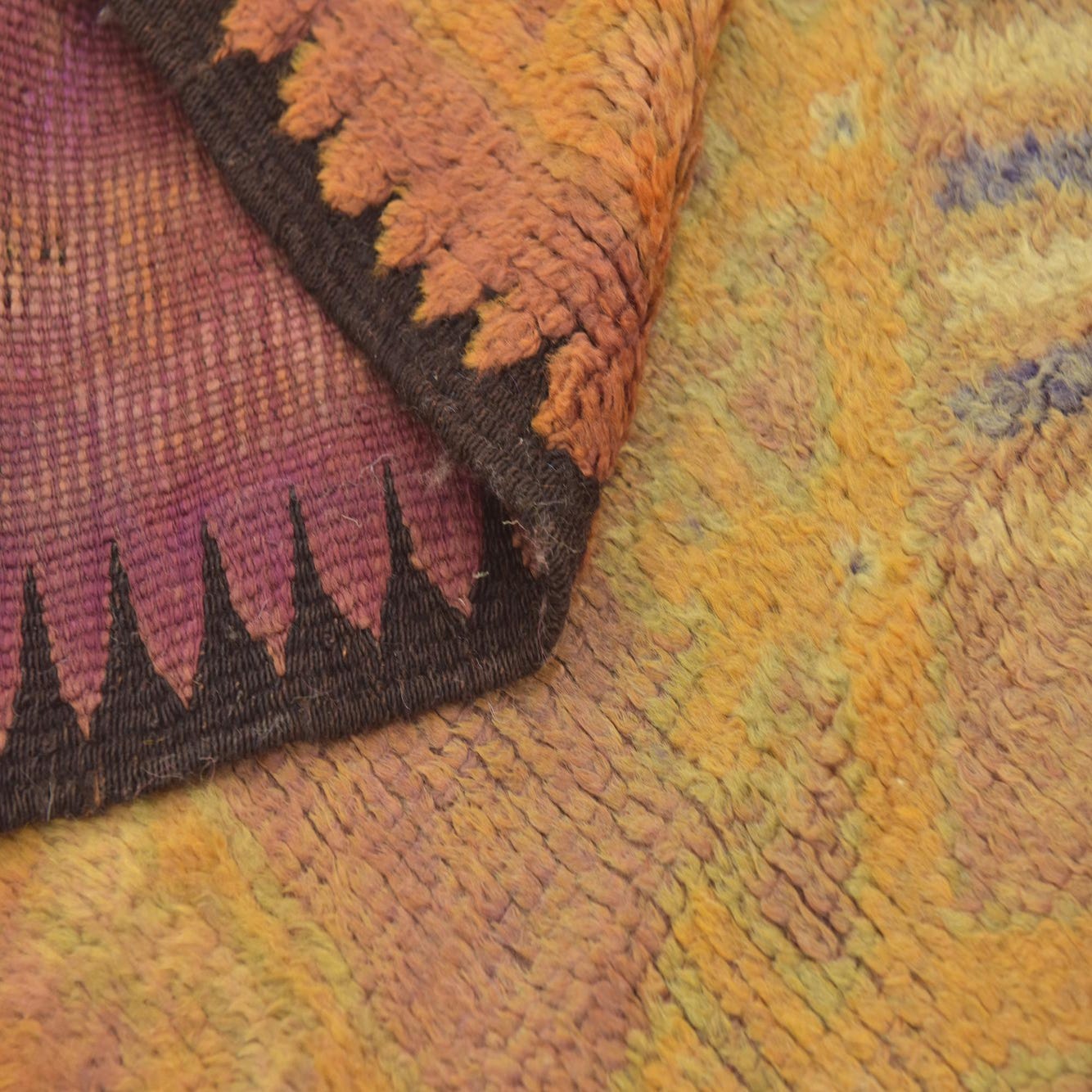 This Moroccan collection rug is a hand-knotted runner, stretching 15 feet in length, crafted from 100% wool, offering a natural and durable composition. Its distinct pattern features a combination of geometric and abstract motifs that provide a unique visual interest to its already engaging color palette. The background is a rich orange hue, accented with complementary colors of beige, cream, and purple. The tactile texture of the wool is preserved in the weaving, providing a tangible sense of craftsmanship and quality.