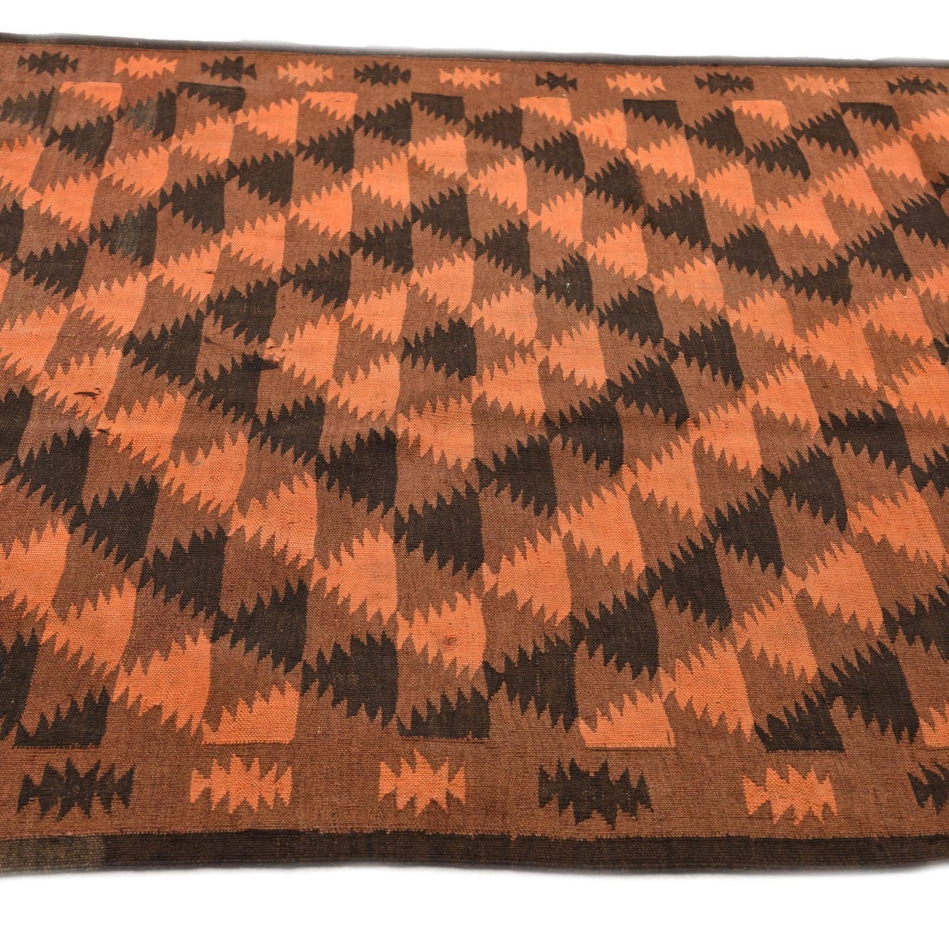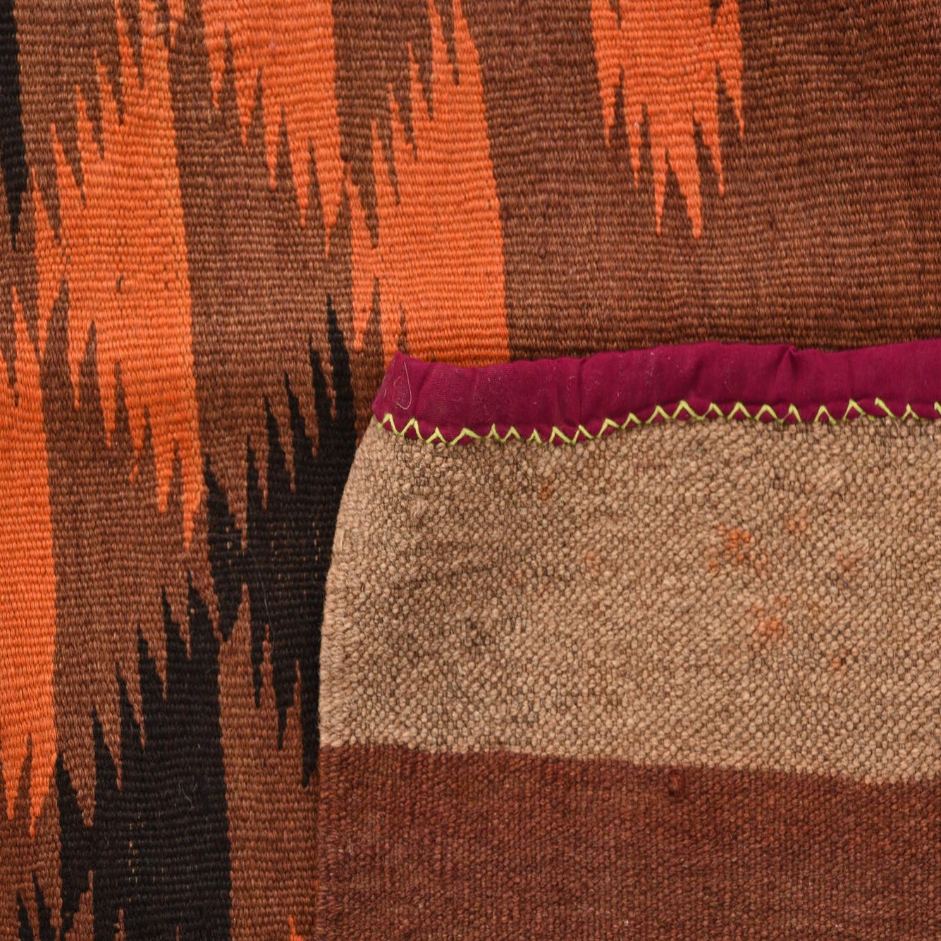 The Kilim Fars collection presents a captivating hand-woven runner rug measuring 16 feet in length, crafted from 100% wool. This piece showcases a dynamic geometric pattern that is both traditional and bold. The pattern features repeating diamond shapes in a thoughtfully chosen palette of orange, brown, maroon, natural, purple, and rust red, set against an orange background that brings warmth to the design.