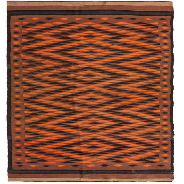 Primary color is Orange. Colors in this rug include: Orange, Brown, Maroon, Natural, Purple, Rust Red.