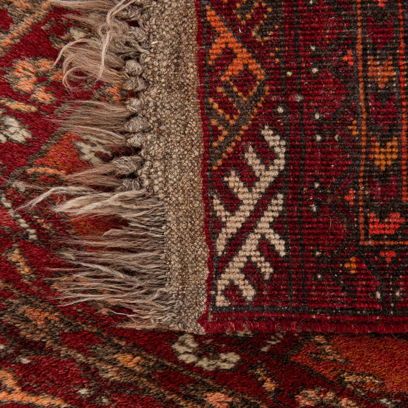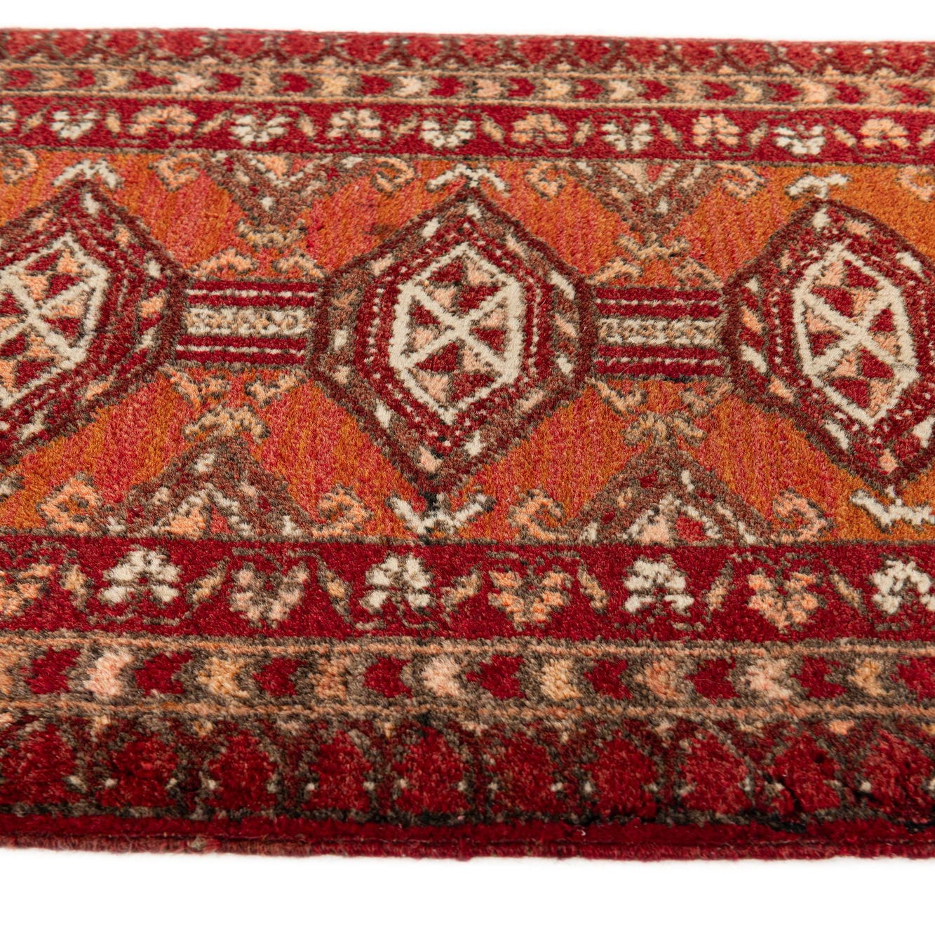 A 1x2 rectangular Afghan Ersari tribal rug in rich oranges and reds with intricate geometric patterns and fringed ends.