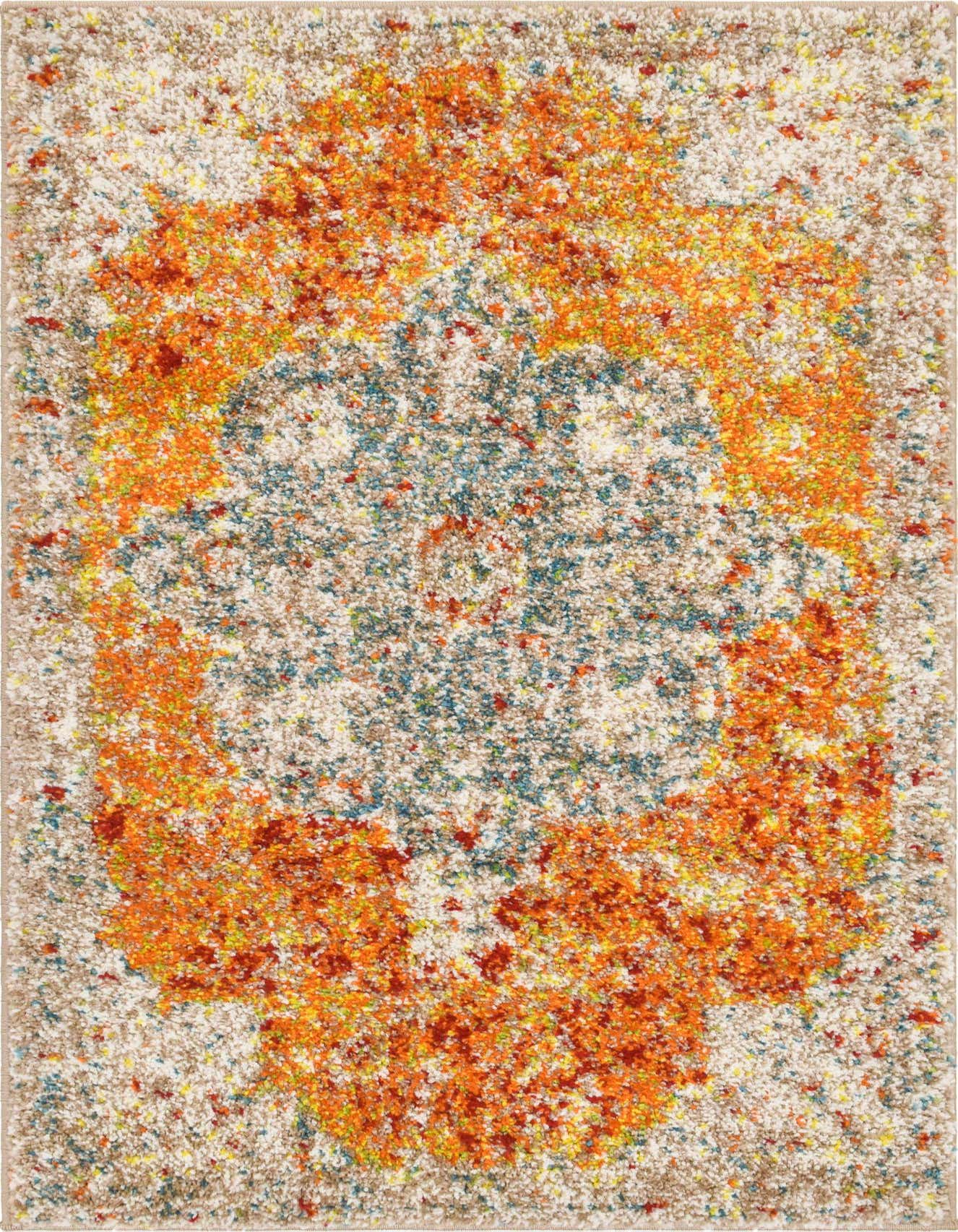 Primary color is Orange. Colors in this rug include: Orange, Beige, Blue, Ivory, Red.