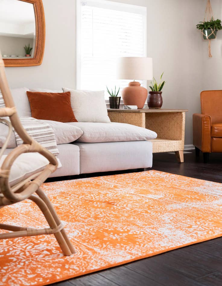 Given its bold orange hue, this rug can energize neutral-toned spaces or complement interiors with warm color schemes. It gracefully bridges the gap between classic and contemporary, making it versatile for various decor styles including transitional, modern, and eclectic settings. Consider integrating this rug into an entryway for an inviting pop of color, or as an accent piece in a living room, kitchen, or office that craves a dynamic focal point.