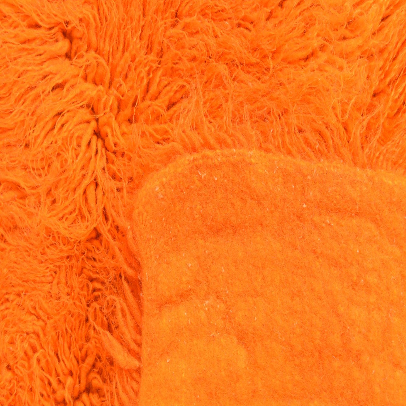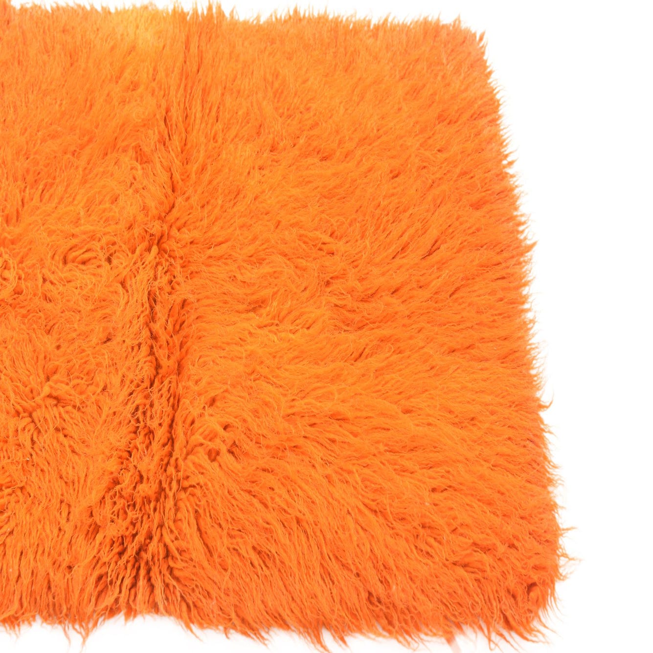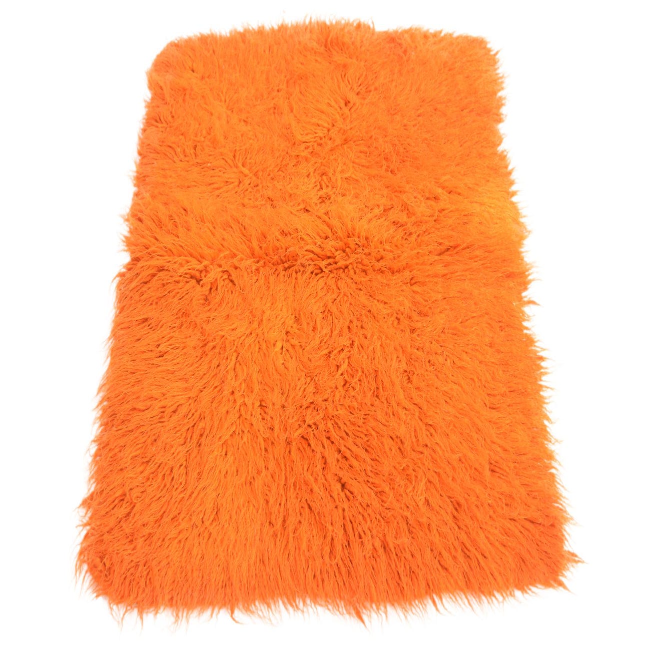 A vibrant orange 2x3 rectangular shag rug, handmade from wool, featuring a plush, high-pile texture.