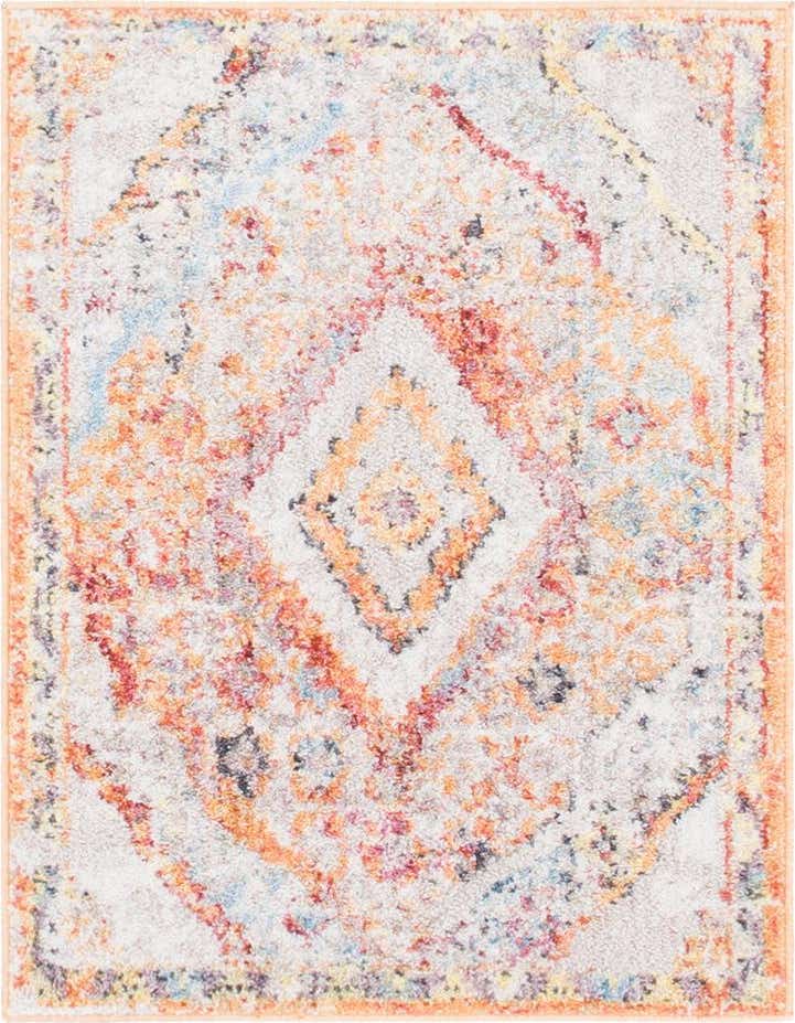 The Williamsburg rug, measuring 2x3, presents a vibrant mélange of colors set against a warm orange background, creating a rich tapestry of shades that include beige, black, blue, burgundy, ivory, yellow, and pink. The design features a blend of traditional and transitional patterns, where the melding of geometric shapes and distressed motifs offers a timeless piece with a modern twist.