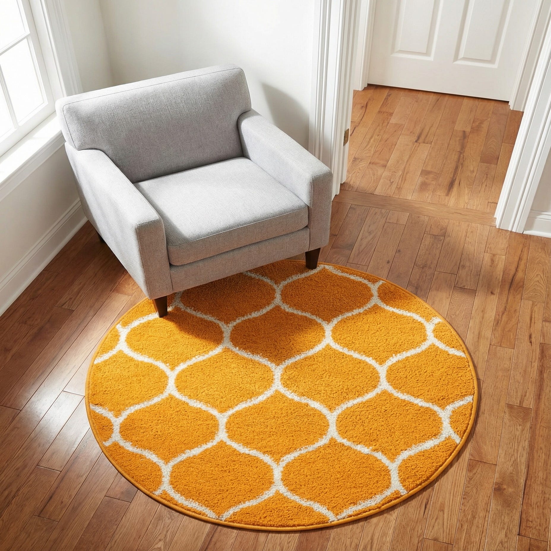 This rug makes a bold accent in a variety of rooms: place it in a small entry or foyer to brighten the first impression, tuck it beneath a bistro table or reading chair for a pop of color, or use it in a child's playroom to add warmth and pattern. It also pairs well with clean-lined mid-century furniture or a neutral living room—think warm wood tones, ivory textiles, and navy accents to balance the orange.