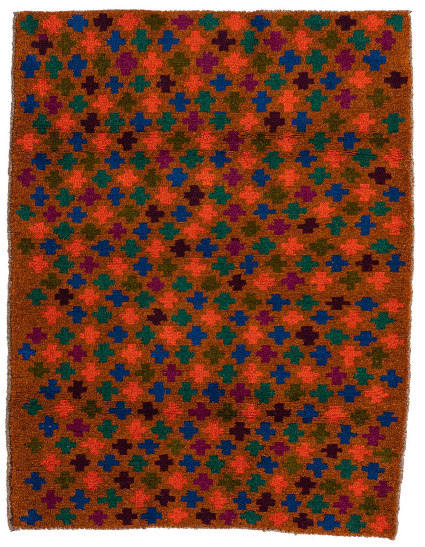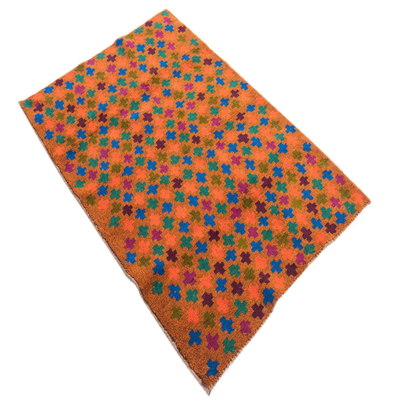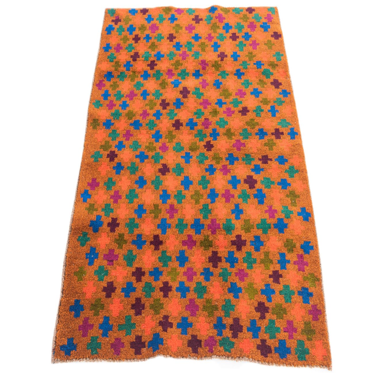 Primary color is Orange. Colors in this rug include: Orange, Green, Maroon, Navy Blue, Red, Purple.