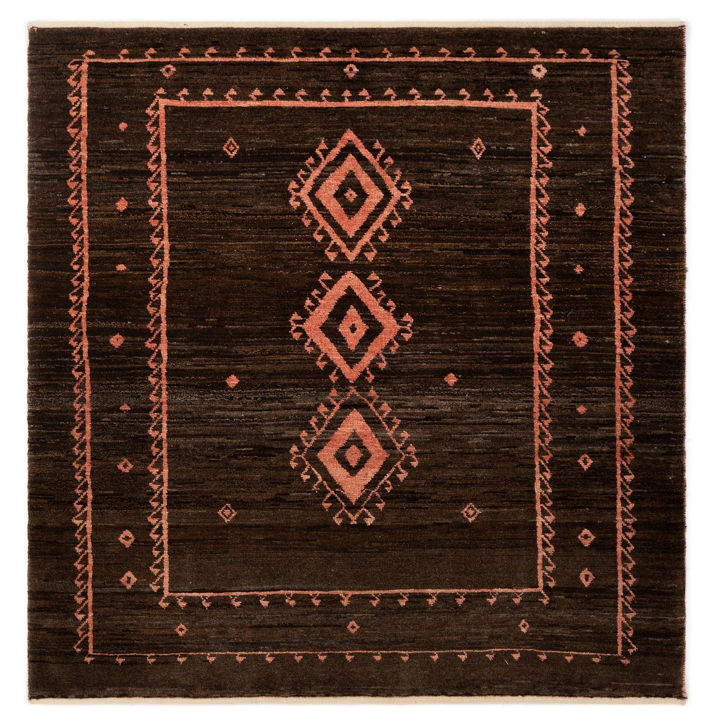 A 3x4 rectangular Kashkuli Persian rug with a dark brown background and three prominent orange diamond patterns down the center, framed by an orange border.
