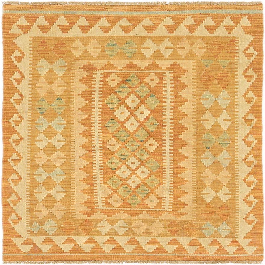 The Kilim Waziri collection presents a hand-woven 3x4 rug crafted from 100% wool, offering both durability and a soft texture underfoot. This particular piece features a vibrant orange background, complemented by a harmonious blend of light blue, light green, gold, and beige hues that create a compelling pattern. The design encapsulates a central geometric motif surrounded by intricate borders, showcasing the artisanal craftsmanship.