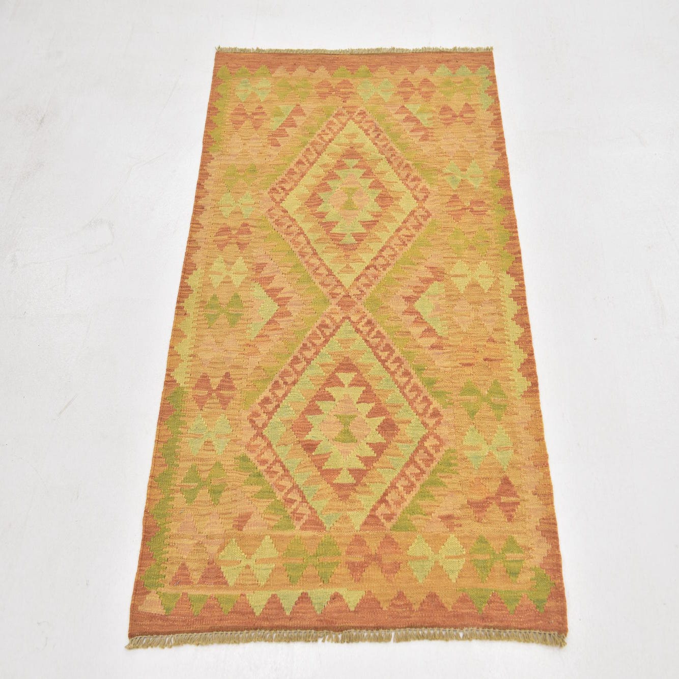 A 3x4 rectangular Kilim Waziri rug featuring a traditional tribal medallion pattern in various shades of orange and subtle green.