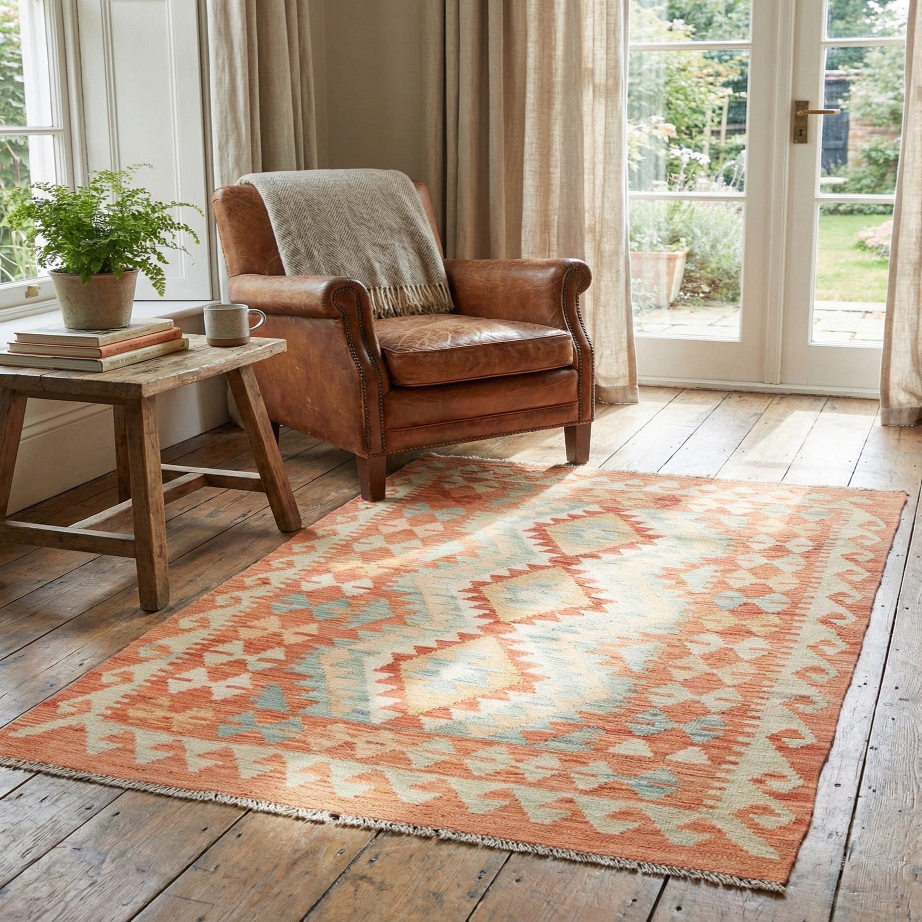 Primary color is Orange. Colors in this rug include: Orange, Cream, Gold, Light Blue, Light Green, Tan.