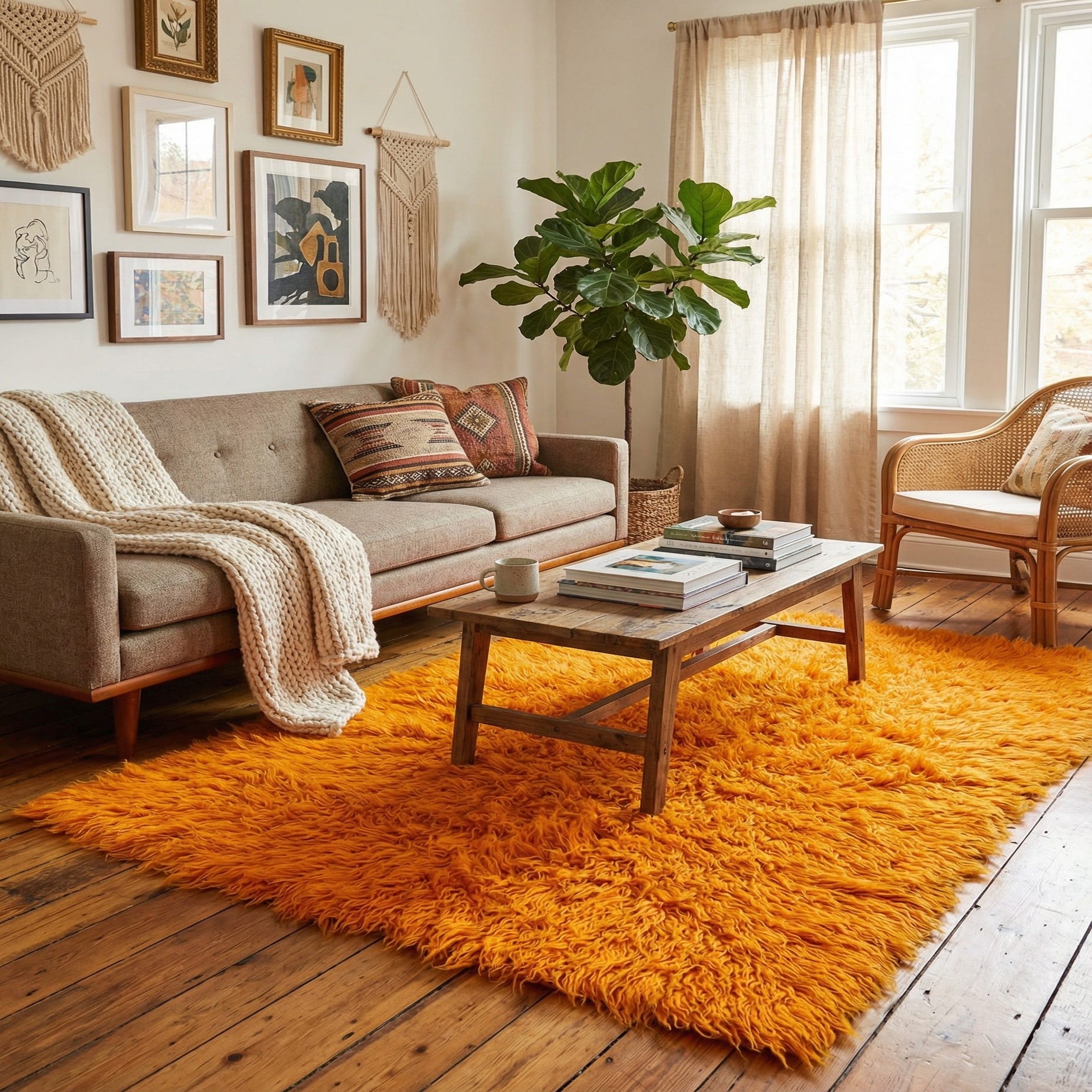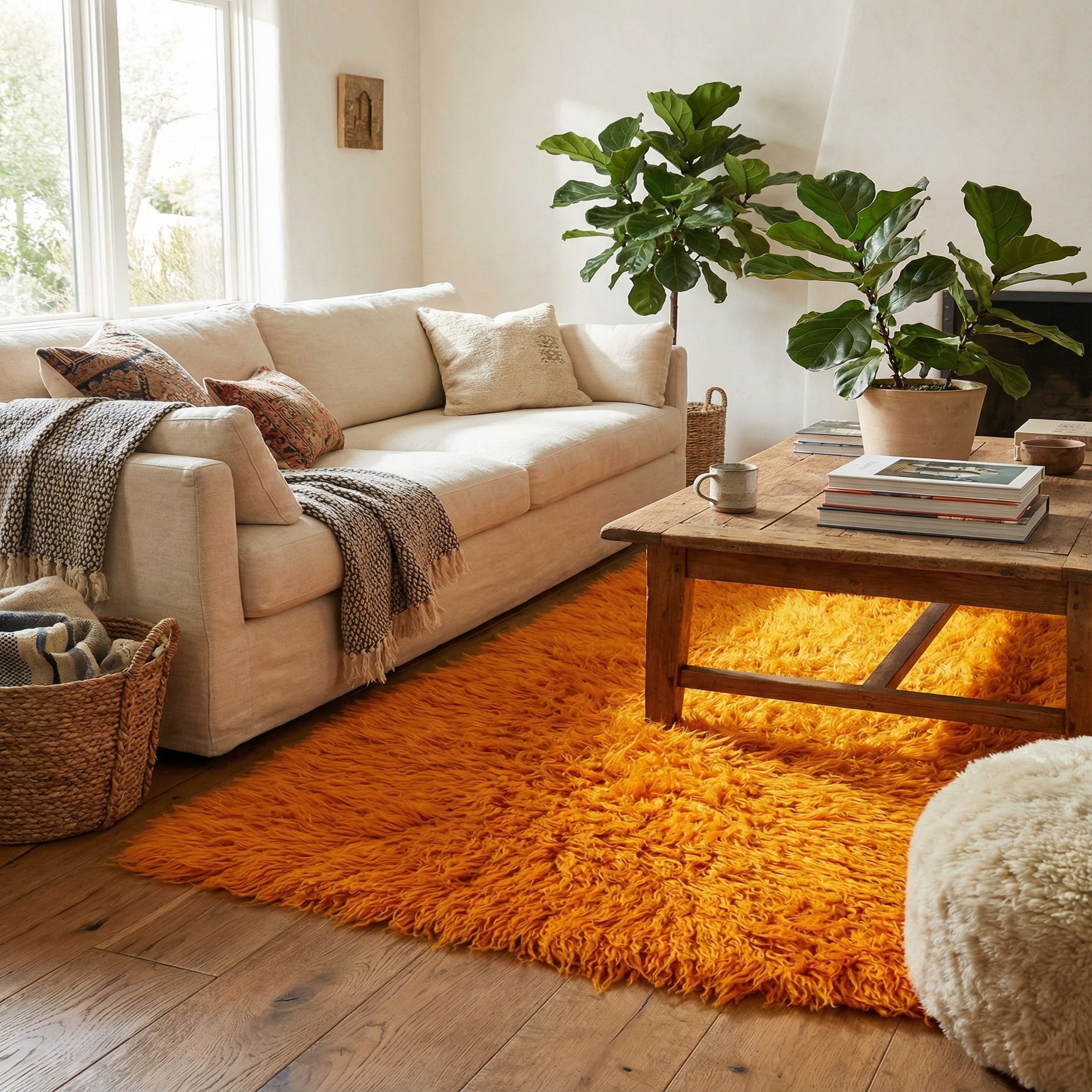 A vibrant orange 3x4 rectangular shag rug made of wool, featuring a plush, textured pile, suitable for indoor use.