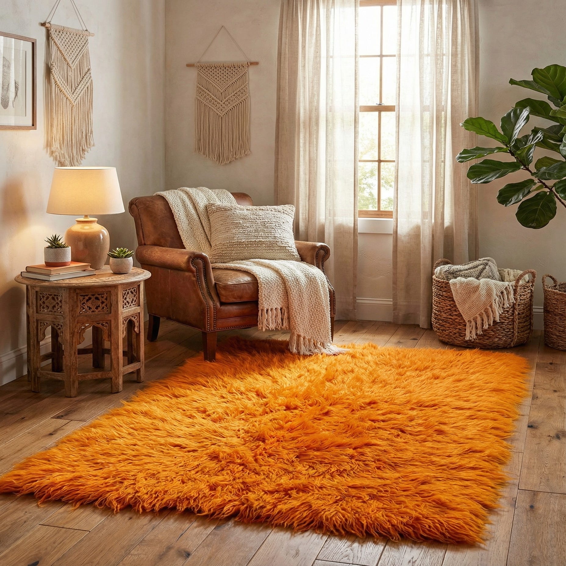 The bold, saturated orange color serves as the background tone, creating an inviting atmosphere and providing an excellent base for a variety of decorating schemes. The natural wool construction ensures durability, making this rug a lasting statement piece. Its simplicity in pattern allows for maximum versatility in styling, from mid-century modern to bohemian or rustic decors.