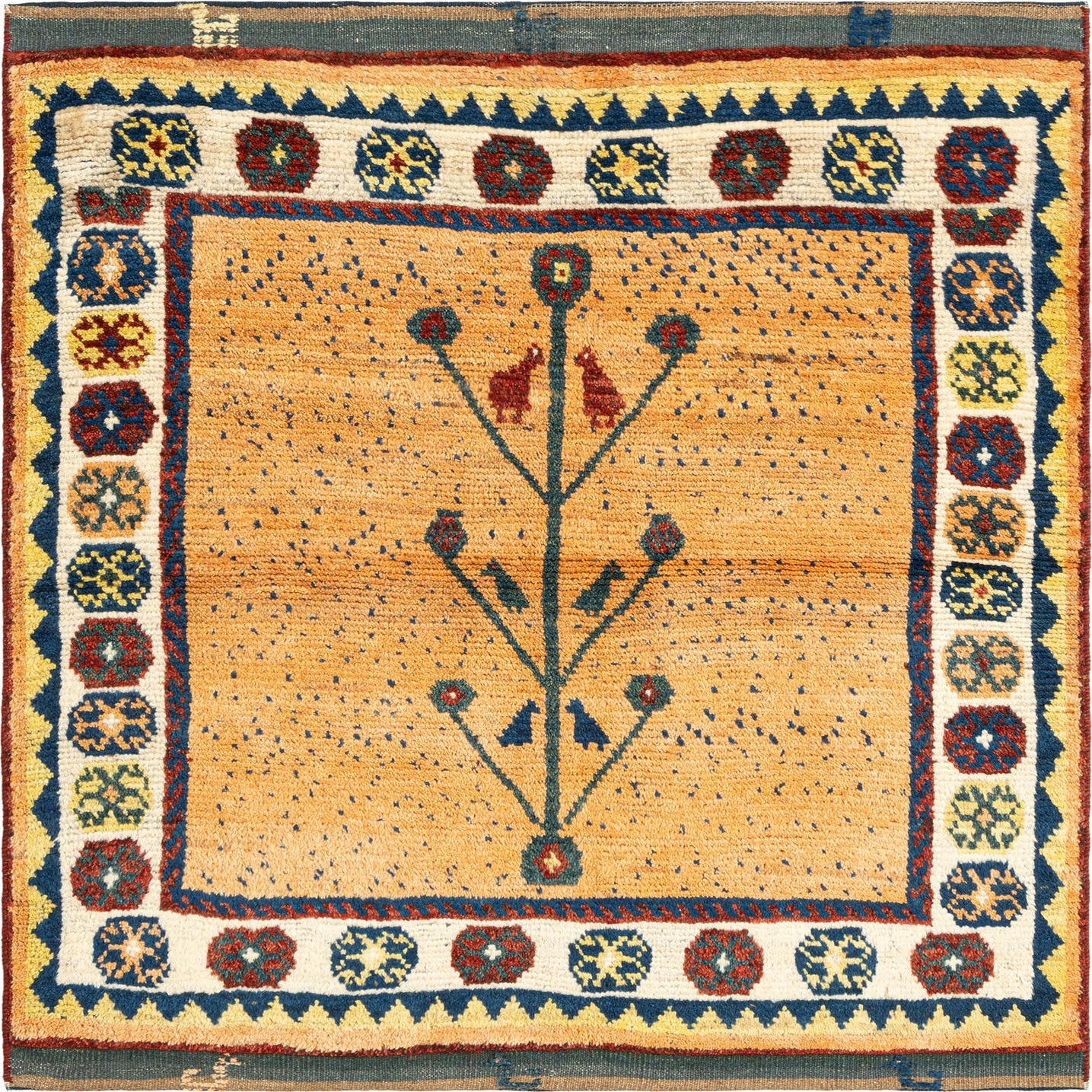 A 3x5 rectangular Gabbeh rug in orange, featuring a central tree-of-life motif with birds and a decorative border.
