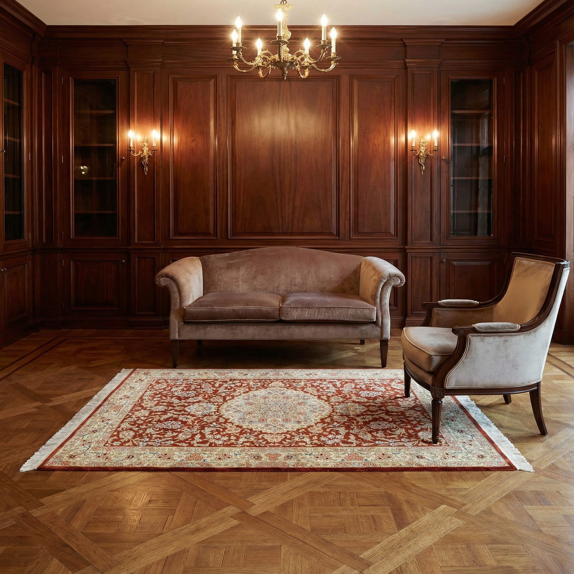Given its traditional design and rich color scheme, this rug is well-suited for interiors that aim to create a sense of warmth and sophistication. It could serve as a stunning focal point in a formal living room, under a coffee table or seating area, or add a touch of elegance to a quiet study or home office. Additionally, its size allows for versatility in placement, whether in an intimate setting or as part of a larger, curated design scheme.