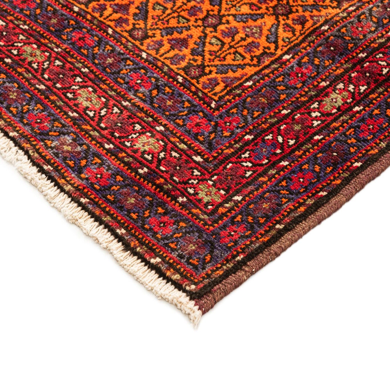 A 3x5 rectangular Gutchan rug with a vibrant orange field and intricate dark red and blue traditional patterns, handmade from sheep virgin wool.