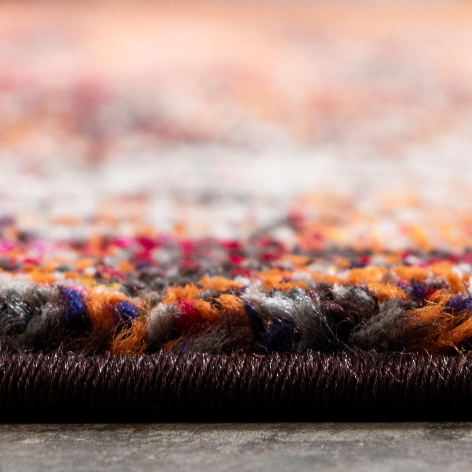 Primary color is Orange. Colors in this rug include: Orange, Beige, Brown, Red, Yellow, Pink, Peach, Puce.