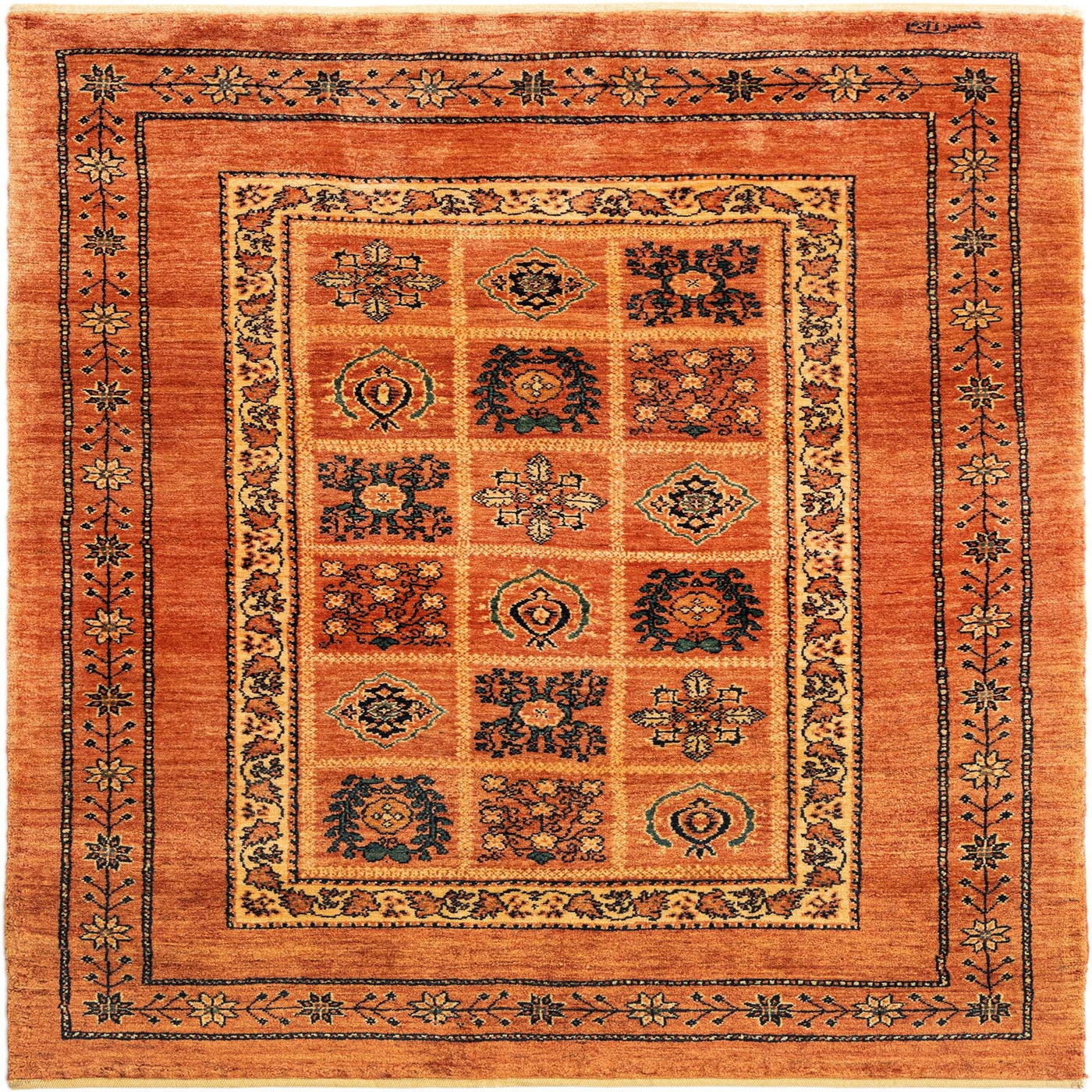 A 3x5 rectangular orange Persian wool rug with a central grid pattern of diverse traditional motifs and a floral border.