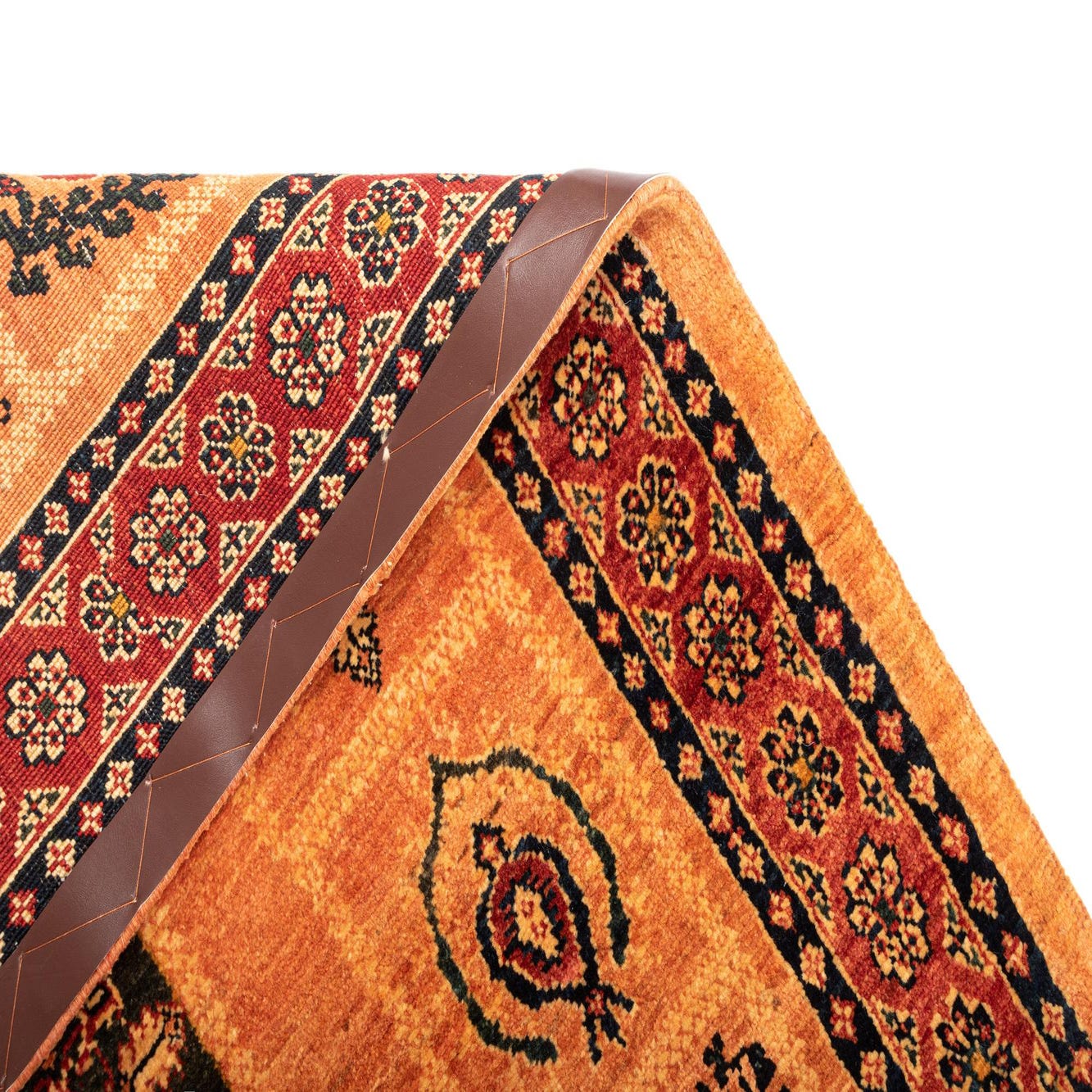 Primary color is Orange. Colors in this rug include: Orange, Orange, Dark Blue, Red, Yellow, Beige, Green.